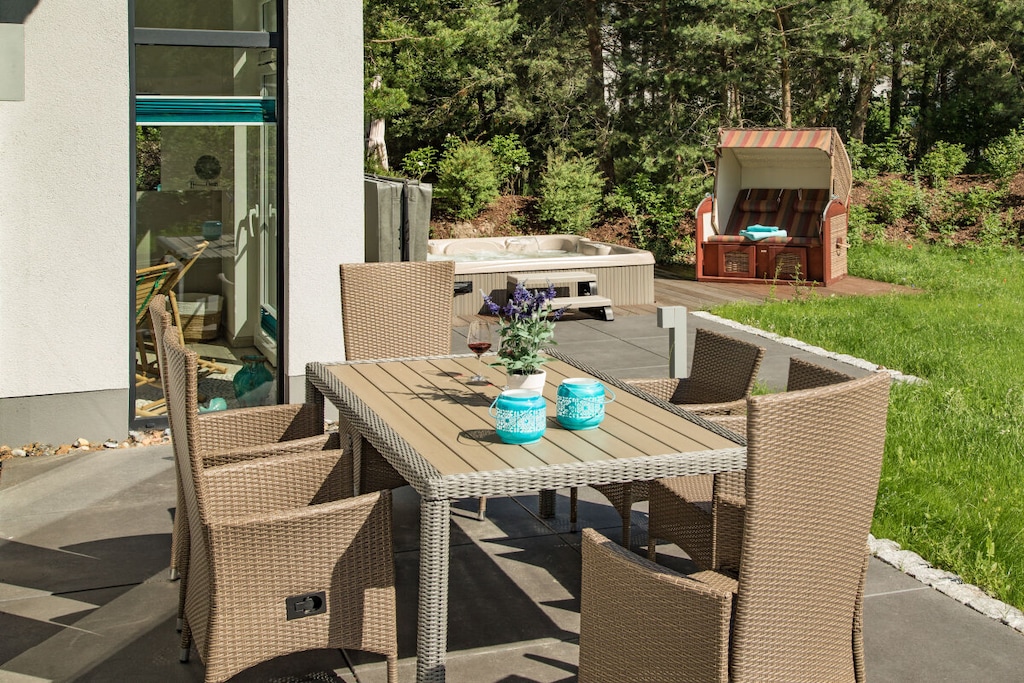 In the 5* beach house, comfort meets personalized guest service – including free Wi-Fi. This non-smoking house boasts high-quality furnishings, underfloor heating, and a fireplace. It offers numerous amenities and plenty of space to relax. The house has a heated outdoor whirlpool, which is available year-round.