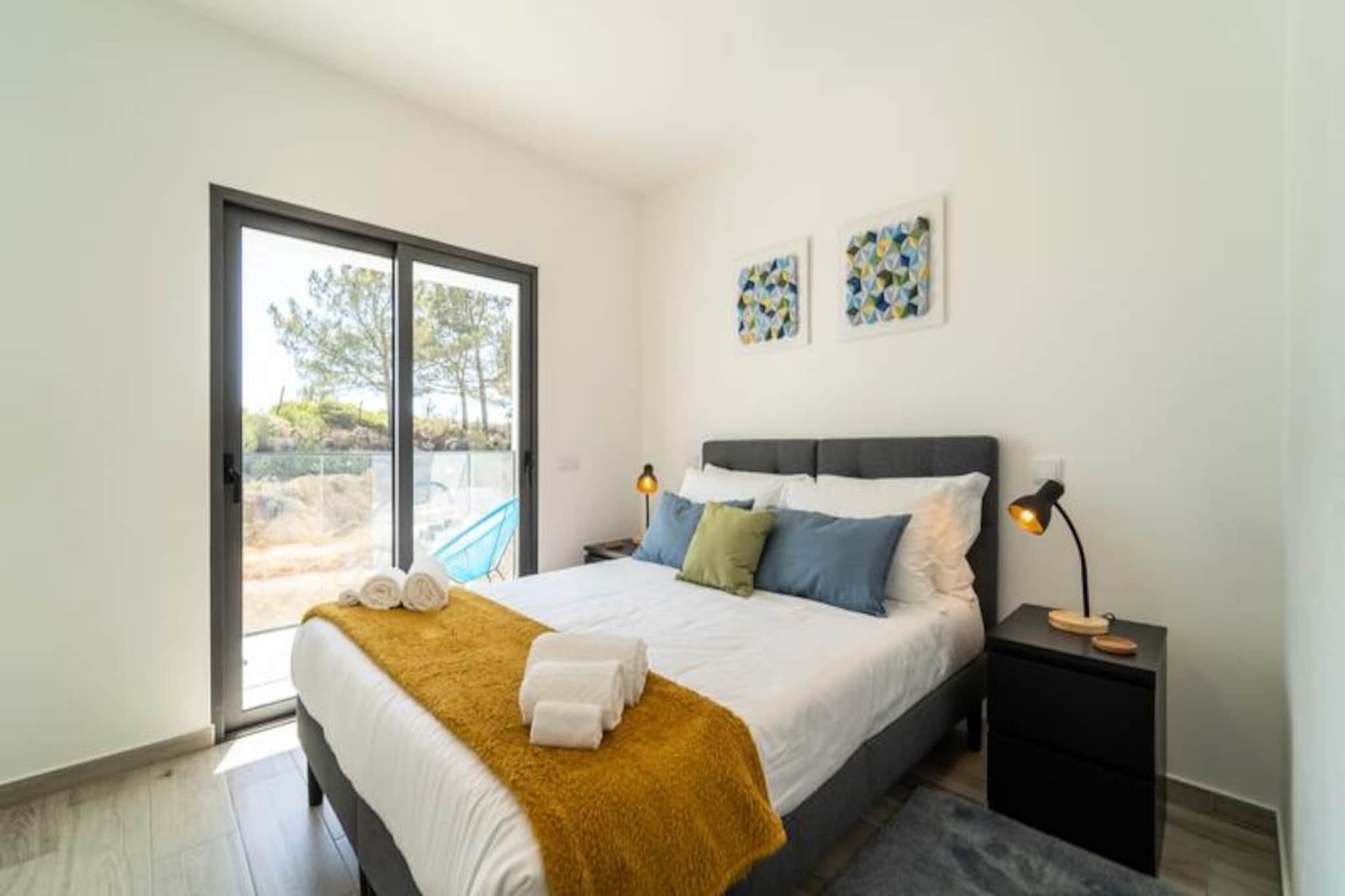 Awaken your senses in this serene 2-bedroom, 2-bathroom apartment perched on the edge of Portugal’s breathtaking Costa Vicentina Natural Park. With panoramic views of the Amoreira River and wetlands, this retreat offers a perfect blend of tranquility and natural beauty. Just a short walk from the Blue Flag-awarded Monte Clérigo Beach and the pristine Amoreira Beach, you’ll find yourself immersed in the unspoiled charm of the Algarve’s west coast. Whether it’s the golden glow of sunrise or the fiery hues of sunset, the two terraces provide a front-row seat to nature’s daily spectacle. \n\nInside, the apartment is thoughtfully designed for comfort and style. The master bedroom features an en-suite bathroom complete with a bathtub and bidet, while both bedrooms are adorned with queen-size beds, luxurious Portuguese linens, and original artwork by a local artist. The living room invites relaxation with its plush sofa bed and 50\