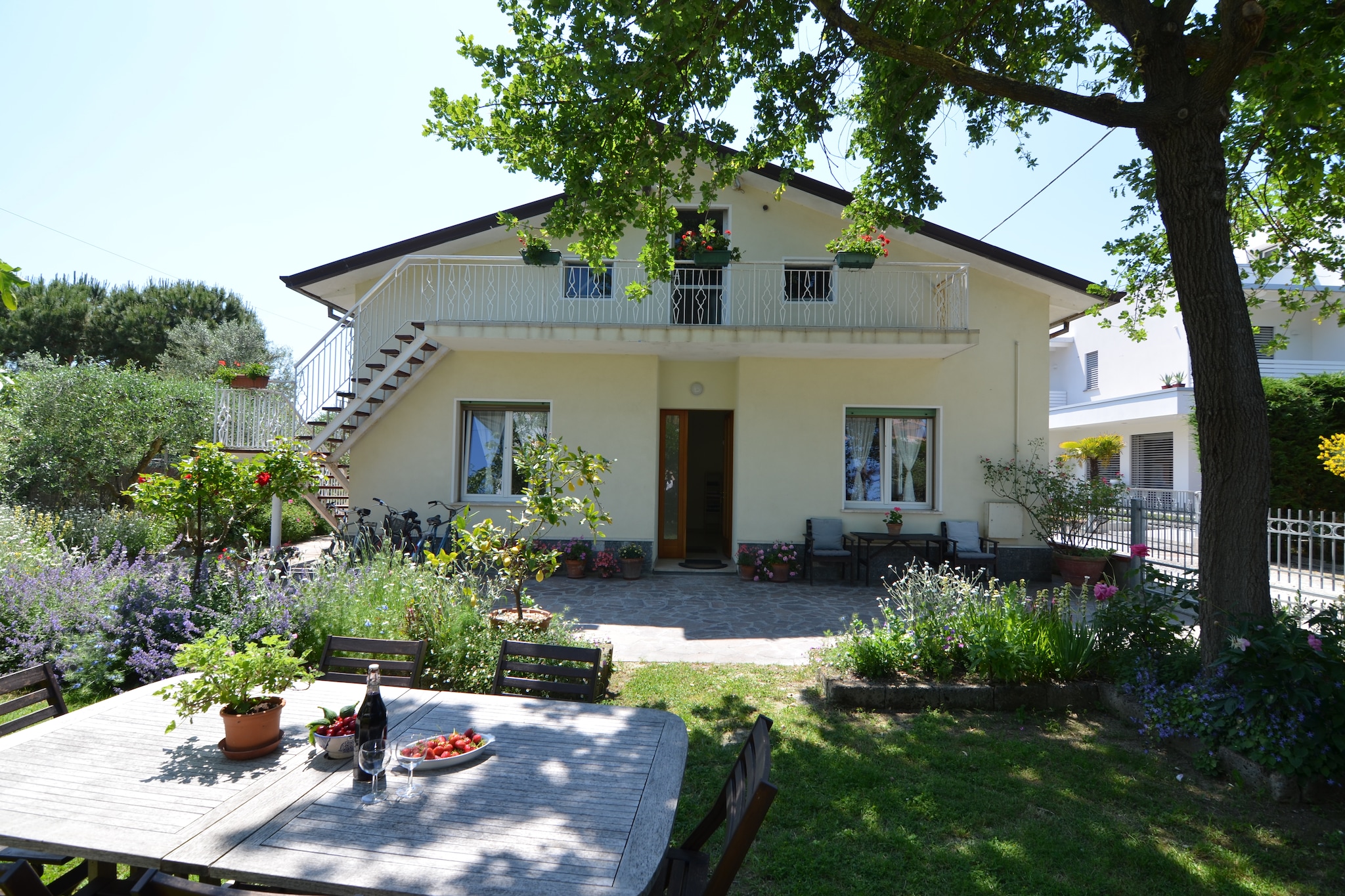 Ground floor: (Living room(double sofa bed), open kitchen(dining table, electric kettle, cooker, hood, oven, fridge-freezer), bedroom(single bed, double bed), bathroom(shower, washbasin, toilet, bidet))\n\ncoffee machine, garden, garden(private), garden furniture, garden furniture, sun loungers, BBQ(shared with other guests), parking, parking, parasol, bicycles available, bicycles available, children\'s bed(on request)