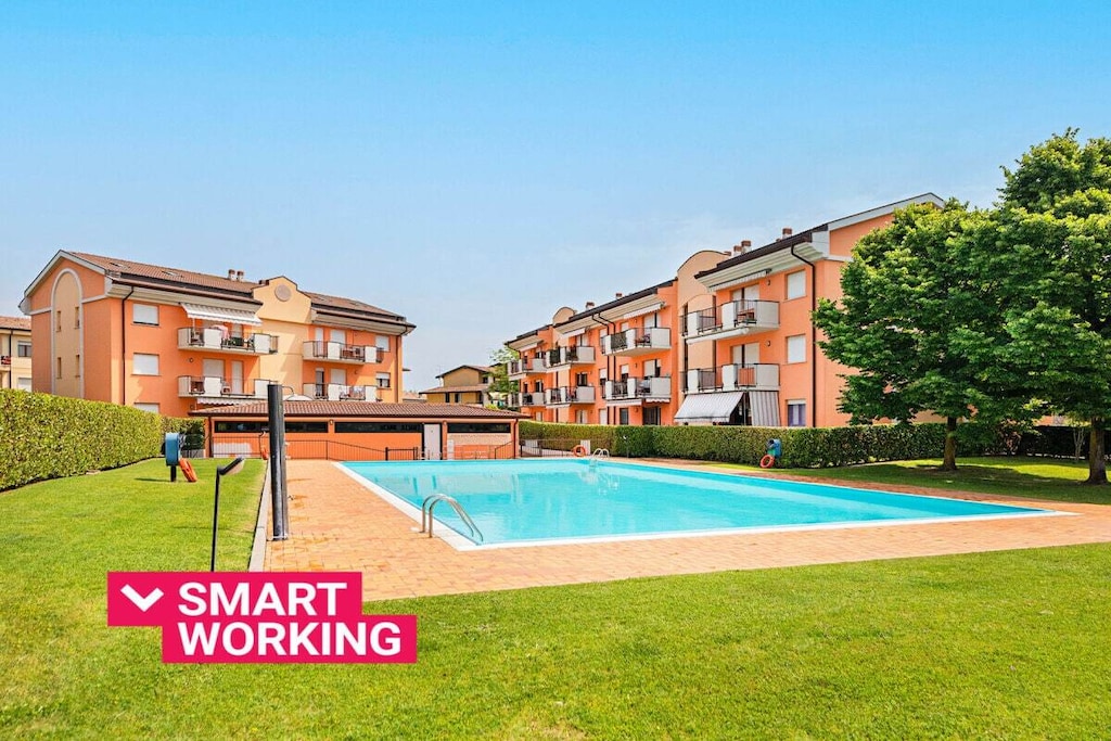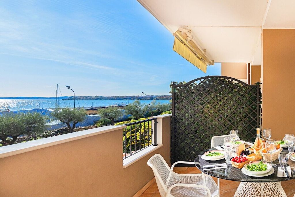The apartment is located on the ground floor and welcomes guests in a bright living room with a comfortable sofa, dining table, TV and an open kitchen equipped with all amenities, including a dishwasher, microwave and toaster. From here, a wide French door leads to the private terrace, furnished with a dining table and two beach chairs to enjoy sunny days outdoors. The sleeping area consists of two bedrooms, the first of which is equipped with a queen-size bed and a wardrobe, while the second has a bunk bed and a wardrobe. A bathroom with shower and washing machine completes the furnishings. Guests benefit from amenities such as air conditioning in every room, heat pump and free Wi-Fi, ideal for working from home. *A shared swimming pool is located in the outdoor area of the building and is open from May 1st to September 30th. The apartment can be reached in 70 minutes via the nearby Verona Airport (VRN).