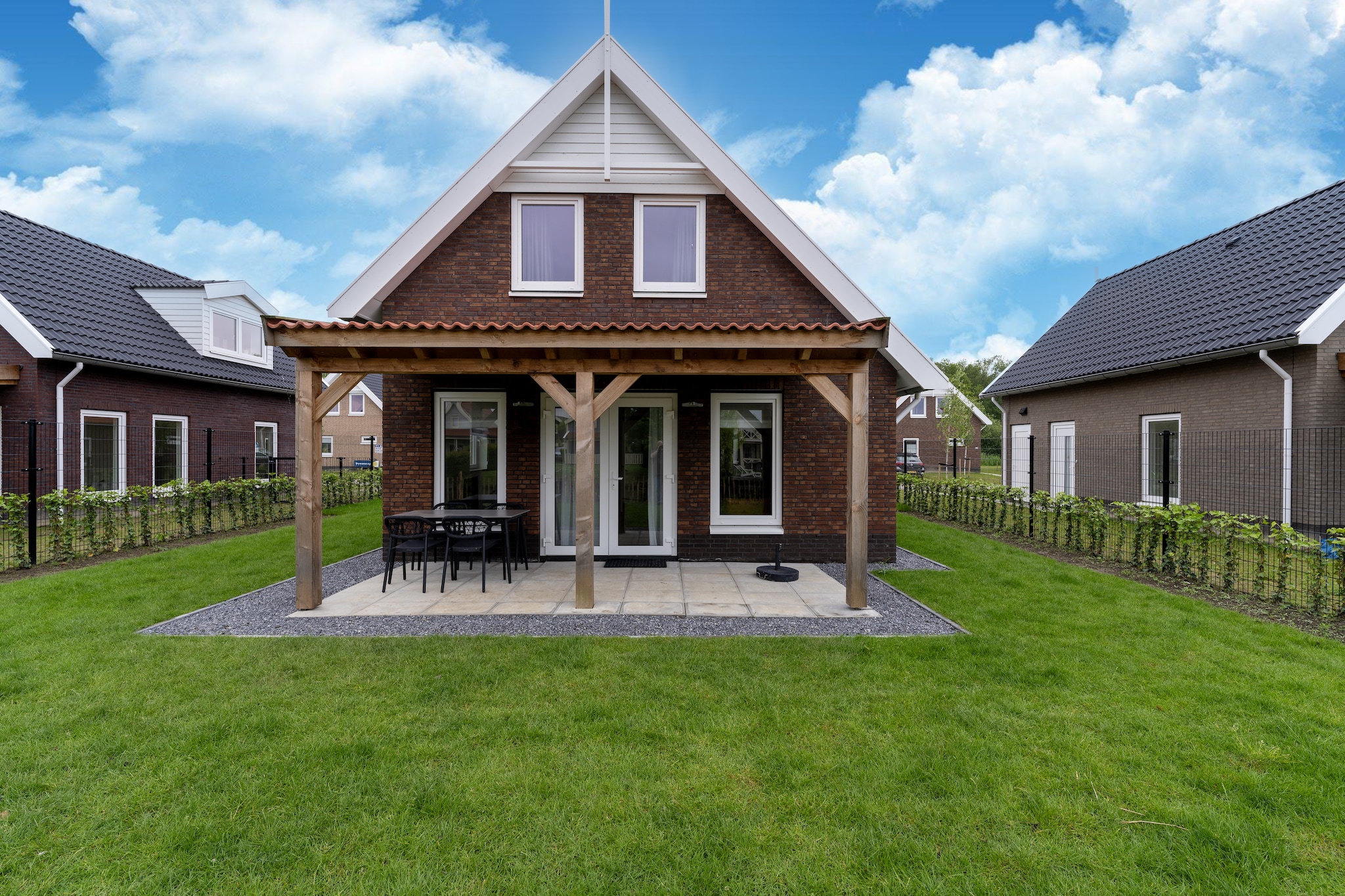Ground floor: (hallway, Living room(TV, seating area), open kitchen(hob(induction), electric kettle, coffee machine, combination microwave, dishwasher, fridge(+ freezer)), toilet(washbasin, toilet), pantry)\n\nOn the 1st floor: (bedroom(single bed, single bed), bedroom(single bed, single bed), Bedroom with bathroom(single bed, single bed, shower, washbasin, toilet), bathroom(shower, washbasin, toilet, hairdryer), Landing(stair gate))\n\njetty, stove, stove, washing machine, garden doors, heating, air conditioning, terrace(roofed), terrace, garden, garden furniture, parking, children\'s bed, high chair