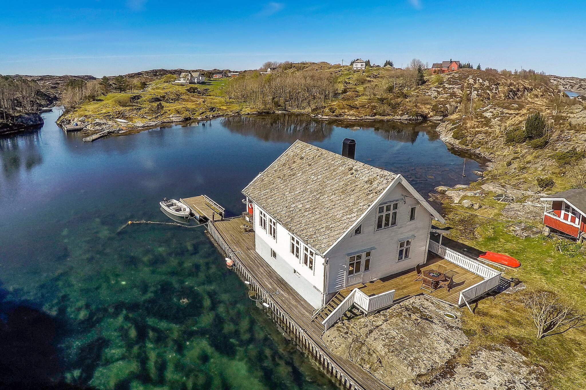 Large holiday home on private island 400 meters from the mainland. Beautiful nature, room for 12. The main floor has an open kitchen/dining room and with wood-burning stove. Apple TV with Norwegian, German, and international channels. The first floor consist of 2 apartments, each with a living room and kitchenette. The living rooms have sleeping alcoves with two beds and thick curtains facing the living room. In total there are 12 beds, 5 in the smallest and 7 in the largest apartment. Exit from common room to the terrace, where the sun can be enjoyed until late in the evening. 4 bathrooms with shower/shower cabinet. Several great outdoor areas with terraces and barbecue areas around the main building and in the terrain. In the boathouse, there is a long table for dinners. After a wonderful meal with home-caught seafood, you can enjoy the wood-fired hot tub, perhaps with bubbles both the glass? Swimming opportunities in the sea via one of many ladders. Filleting bench with light and running water in the boathouse. Boats for rent when booking the holiday home: 1x 21 ft Øien 620F with small cabin 1-2 persons, 90 HP Suzuki , GPS/chart plotter/sonar and 8 rod holders 1x 24 Norwest740 with 86 HP engine, GPS/Chart plotter/sounder, closed cabin with toilet 2x kayaks 1x canoe 1x pedalos