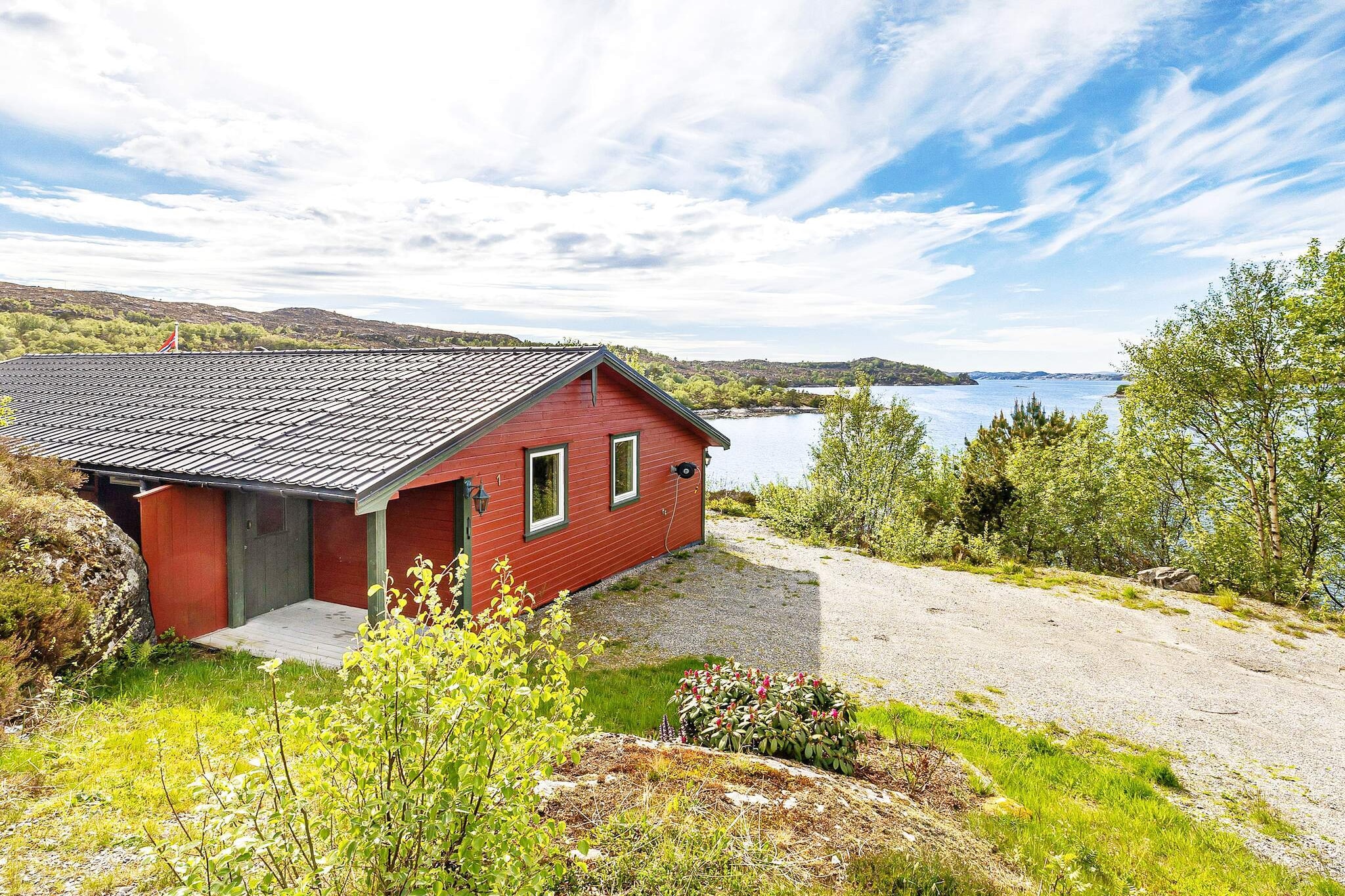 Holiday home on an island in the Sognefjord, an Eldorado for boating, fishing and diving. Locatde by the sea with a quay, floating jetty, shoreline, boathouse and large plot. About 2 hours from Bergen. Holiday home with beautiful surroundings. On the ground floor, there is a hallway with stairs to the attic, bathroom/laundry room, kitchen and living room. From the terrace, there is a door leading to the hallway and stairs to the attic. The living room is comfortably furnished with a sofa group and dining table and direct access to the terrace. Well-equipped kitchen. On the first floor, there are 2 bedrooms with a double bed and 2 small rooms, each with a single bed. TV and internet via fiber with German and international channels. Heat pump and wood stove. Lovely, large terrace of 40 m2 with garden furniture and an annex for storing garden cushions and barbecue. In addition to fishing and other activities, the holiday home is perfect for relaxing in quiet surroundings and hikes in the beautiful coastal landscape. The area has rich wildlife with seabirds and eagles, por-poises, otters, and the occasional small whale. Great for mountain hikes and experiences, like in the mountain Veten at 194 m.a.s.l. or Tjørefjellet and Lifjellet. Lots of mountain lakes where you can fish (remember fishing license). Close by, you find Skjerjehamn with the statue of Olav and local culture such as an annual festival with an impressive line-up of artists. This is an idyllic place we highly recommend, an old trading post that was refurbished in 2007, and where you can enjoy dinner and locally brewed beer in lovely surround-ings. The village of Byrknes with grocery stores and services is approximately 6 km away. Bergen, with its attractions, shops and restaurants, is just 1.5 hours' drive away. 3 boats for rent, located at the floating jetty directly below the holiday house. Bench for fileting fish. The holiday home is located on an island and the boat trip takes 2 minutes (150 m crossing). Owner will be present on arrival. Free parking in a shared car park at the marina.