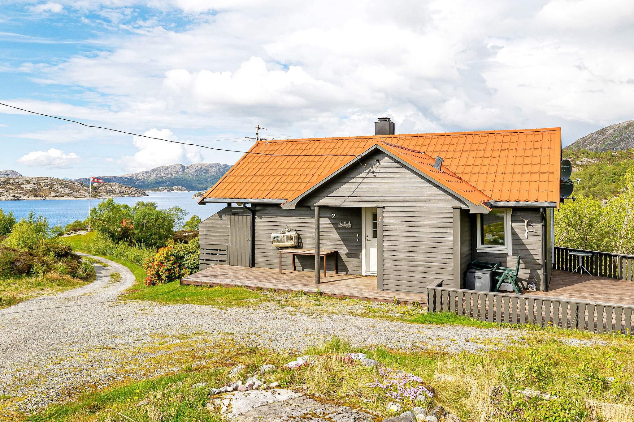 Holiday home located in a fantastic coastal landscape, situated on a hill with a panoramic view and only 20 m from the coast. An Eldorado for boating, diving, and fishing enthusiasts by the Sognefjord. The holiday home is 76 square meters and contains hallway, entrance hall, bathroom/laundry room, storage room, 3 bedrooms: 1 with a bunk bed, 1 with double bed and 1 with a family bunk bed (120cm x 75 cm) and a cot. Living room with open plan kitchen. From the dining table, you have a great view of the fjord. The holiday home has an air-to-air heat pump. TV, satellite with access to German and international channels. Canal Digital. Access from the living room to a partly covered, large terrace with garden furniture and gas grill. The terrace extends further towards the front towards the sea. In the basement, there is a freezer and plenty of space for fishing equipment and life jackets. Below the terrace, a path leads down to private quay with floating jetty and mooring area only 20 m from the holiday home. Directly above the holiday house there is a sheltered barbecue area with fire pit, benches, and a table. Close by you will find Skjerjehamn, an old village restored in 2007 where you can enjoy dinner and home-brewed beer. Every year at the end of July, there is a festival here with famous artists. From the holiday home, there is approx. 8.2 km to the town of Byrknes with grocery store and service offers. Bergen with its attractions, shops, and restaurants is 1.5 hours away. The boat is located at the floating jetty directly below the holiday home. Boat for rent: 1 x White Shark 18 feet with new engine 115 hp, 4 stroke engine, chart plotter, sonar, 6 rod holders.