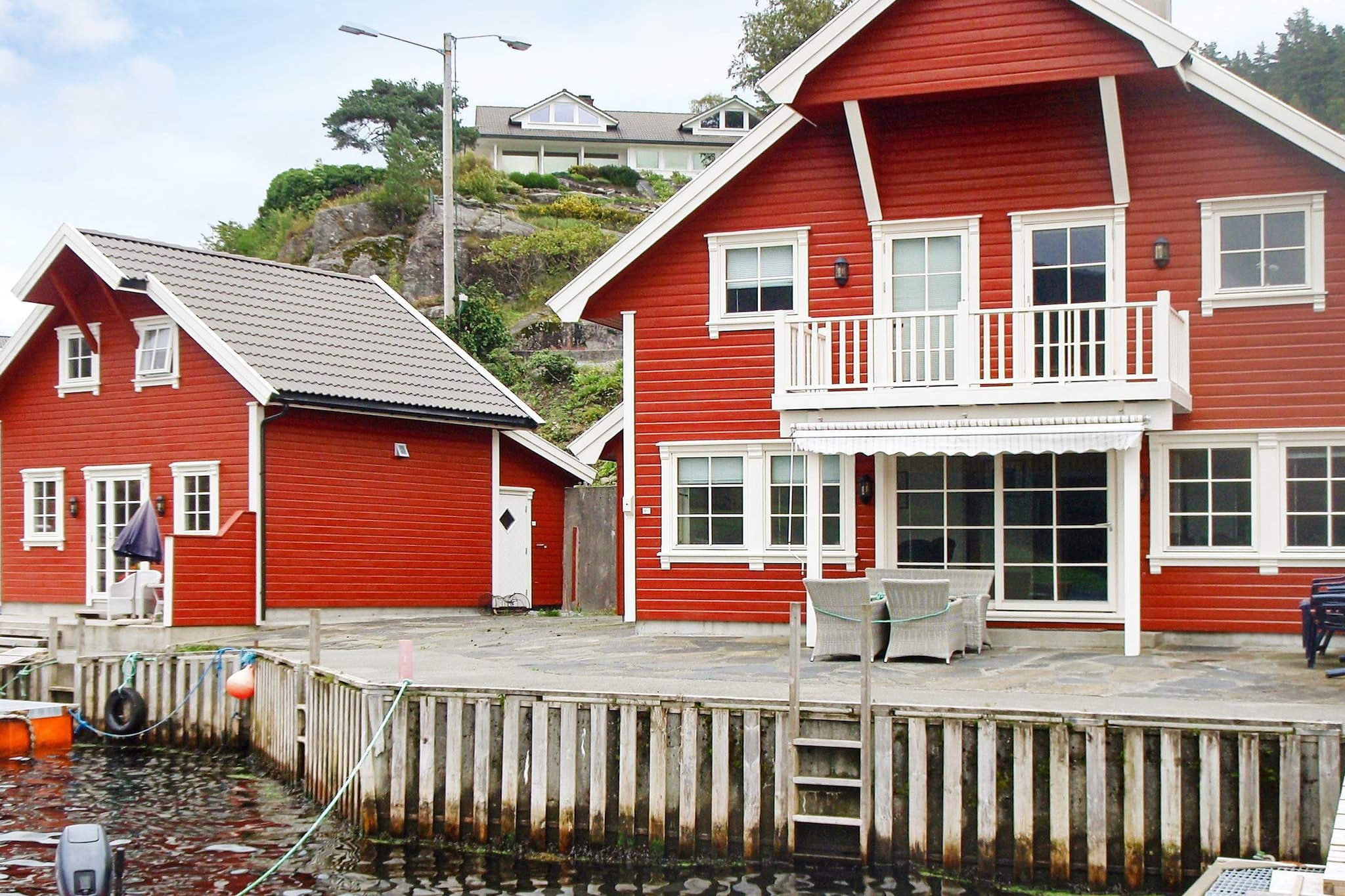 If you wish to live in a large, well-equipped holiday cottage 3 metres from the sea, with boats for rent, this is the place for you! From the cottage you can enjoy the view of the fjord and fire up the grill with today's catch. This large house with 3 floors and room for 11 people, has an idyllic location on a dock in a maritime environment. It is perfectly set up for fishing. You can rent boats just outside your living room. The cottage has a practical set up. There are 4 bedrooms and a mezzanine. In addition to the registered beds, there are extra beds available, and thus the capacity is 13 people in the house. There is a living room with a dining table on ground floor and a living room with a TV on 1st floor. The 200 litre freezer is located in a storage room. Here you also find life jackets. Outside there is a sheltered area with furniture, where you can relax while watching boats pass by. There is a grass field and playground where you can play football and volleyball. There is a bathing ladder on the dock, approx. 10 metres from the house. There is plenty of fish to catch, as well as crab and mussels. Good fishing spots can be found marked on a map in the cottage. You can also go ice fishing in winter, in the mountain lakes. There is a river with trout and salmon, with the fishing season opening respectively May 1st and June 20th. The famous pulpit rock is a two hour drive away. Possibility to book use of a sauna (room for 5-6 people) for NOK 50,-. The sauna is shared with the other units of the holiday complex.