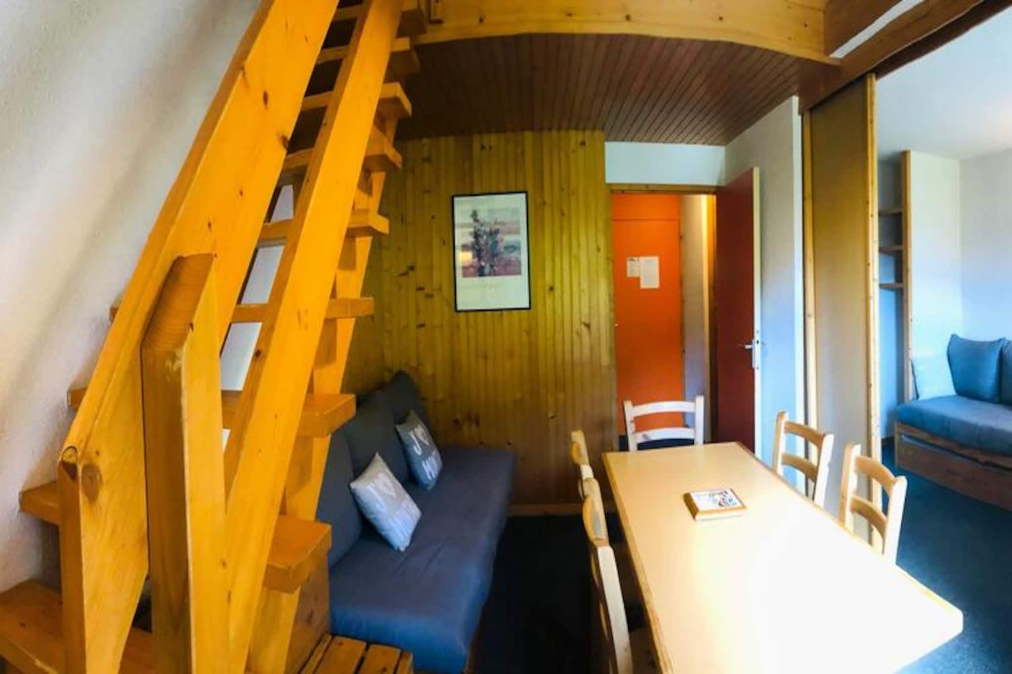 At the heart of the vibrant Les Choucas residence, this charming duplex apartment offers a welcoming retreat for ski enthusiasts and mountain lovers alike. With its prime location at the foot of the slopes and just steps from the resort’s bustling center, you’ll enjoy effortless access to ski lifts, shops, and restaurants, making every moment of your stay convenient and enjoyable. The south-facing balcony provides stunning views of the snowy pistes, inviting you to start your day with the crisp alpine air and breathtaking scenery. \n\nSpread across two levels, this 40m² apartment comfortably accommodates up to six guests, making it ideal for families or small groups. The first level features a cozy living-dining area with two single sofa beds, a fully equipped kitchen with modern appliances, and a separate toilet with a washbasin. Upstairs, the mezzanine offers two bunk beds and a single bed, while the private bedroom includes two single beds. A bathroom with a bathtub completes the layout, ensuring a relaxing end to your adventurous days. Additional amenities include free parking, an elevator, and individual ski lockers for your convenience. \n\nBeyond the residence, the resort buzzes with activity. Whether you’re exploring the Paradiski domain, indulging in après-ski delights, or simply strolling through the lively village, there’s something for everyone. In summer, the area transforms into a haven for hikers and cyclists, with trails winding through lush landscapes and panoramic views of the Tarentaise Valley. This apartment is your gateway to unforgettable alpine experiences, offering comfort, convenience, and the perfect setting for creating lasting memories.