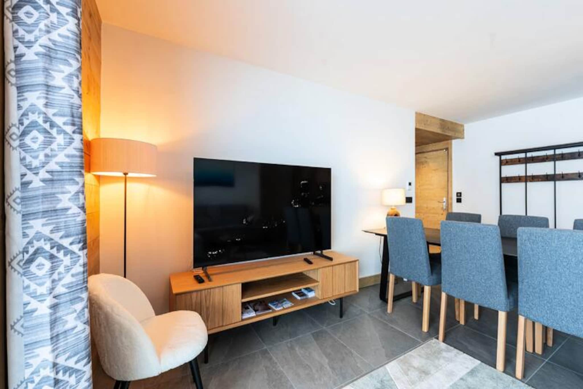 Spanning 88m², this spacious ground-floor apartment is designed to accommodate up to eight guests in absolute comfort. The bright and inviting living room features a plush corner sofa and a large television, creating the perfect space to unwind after a day of adventure. The fully equipped open-plan kitchen, complete with a wine cooler and Nespresso coffee maker, makes dining in a pleasure. The sleeping arrangements include a luxurious master suite with an en-suite shower and queen-size bed, a cozy children's room with bunk beds, and a versatile twin room. Additional amenities such as a washer/dryer, ski locker, and private parking ensure a hassle-free experience.