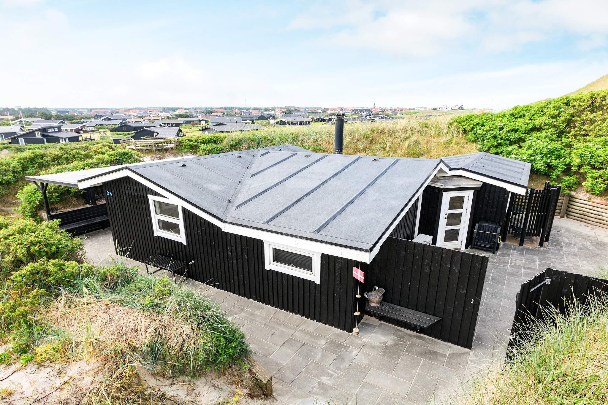 Idyllic holiday home with a unique location in a popular holiday home area close to Løkken town and beach. The house is very welcoming and decorated in a cozy, Nordic style. There is a spacious bathroom, bedroom and open, well-functioning kitchen / living room with good wood stove and heat pump and a Smart TV for the cozy evenings if the weather is bad. From the living room of the house there is access to an enclosed patio with a heated annex. In front of the house is a cozy, covered terrace with heat lamp, where you can gather for a barbecue dinner or enjoy a glass of wine or a cup of coffee while the sun goes down over the sparkling North Sea. There is an outdoor shower, which is completely secluded, and its own path to the water. From the bench by the house there is a sea view and a beautiful view of Løkken town. Sandbox for the kids. The house is located down in a dune only approx. 25 m from the beautiful sandy beach and still close to the center of Løkken, which is known for the characteristic white beach houses and the large pier.