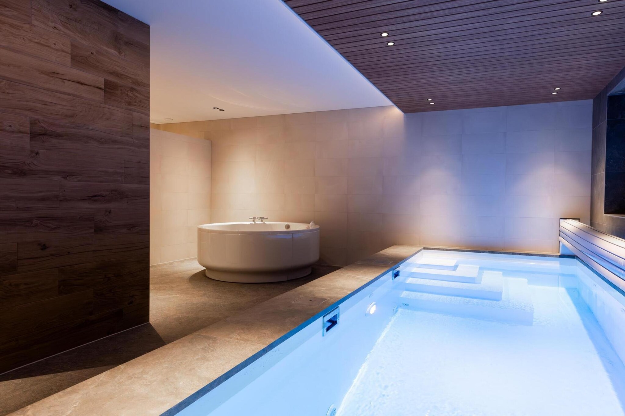 Ground floor: (Living room(seating area), dining room(dining table), open kitchen(cooker, coffee machine, oven, microwave, dishwasher, fridge-freezer), Bedroom with bathroom(double bed, shower, washbasin, toilet), Bedroom with bathroom(double bed, shower, washbasin, toilet))\n\nOn the 1st floor: (Bedroom with bathroom(double bed, shower, washbasin, toilet), Bedroom with bathroom(double bed, shower, washbasin, toilet), Bedroom with bathroom(bunk bed or 2 single beds, bunk bed or 2 single beds, shower, washbasin, toilet))\n\nBasement: (hot tub, shower, toilet, sun loungers, private indoor pool)