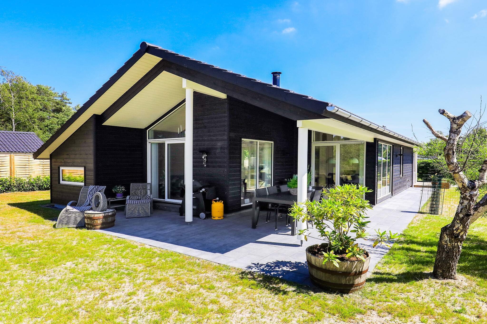 Internet Access DSL, open kitchen(cooker(electric), hood, coffee machine, microwave, dishwasher, fridge-freezer), Living/bed room(TV(german television channels, danish TV channels (DR1 and TV2)), CD player, stereo unit), bedroom(double bed), bedroom(double bed), bedroom(double bed), bathroom(bathtub or shower, washbasin, toilet, washing machine), heating(electric), terrace, terrace(roofed), BBQ, air to air heatpump