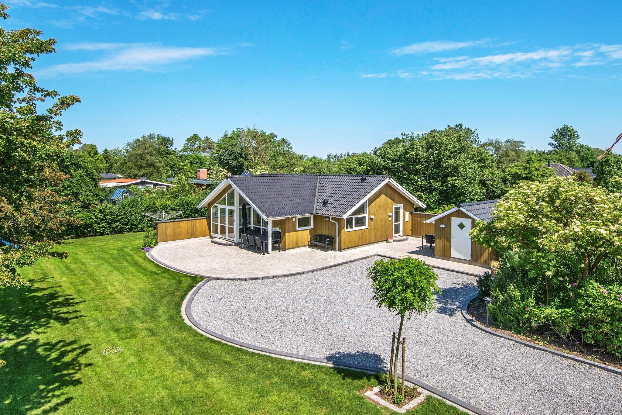 Holiday home with whirlpool and sauna, located within walking distance of the beach at Skovmose, on a quiet cul-de-sac directly next to open green areas. The natural gathering point of the house is the open-plan kitchen and living area with a wood-burning stove and direct access to the terrace. The attractive bathroom features a lovely whirlpool bath and a brick shower, perfect for rinsing off sand and saltwater after a swim in the sea. On cooler days, you can enjoy the warmth of the sauna. A cot and highchair are available in the house. Wireless internet with 200 Mb/200 Mb makes streaming and online activities easy. The two terraces face east and west, allowing you to enjoy the sun from morning to evening. When the evening dew sets in, you can retreat under the covered section. In the garden, you will find a play tower with swings and a sandbox, a fire pit, and a trampoline available from April to October (use at your own risk/insurance). The house is not rented out to youth groups.