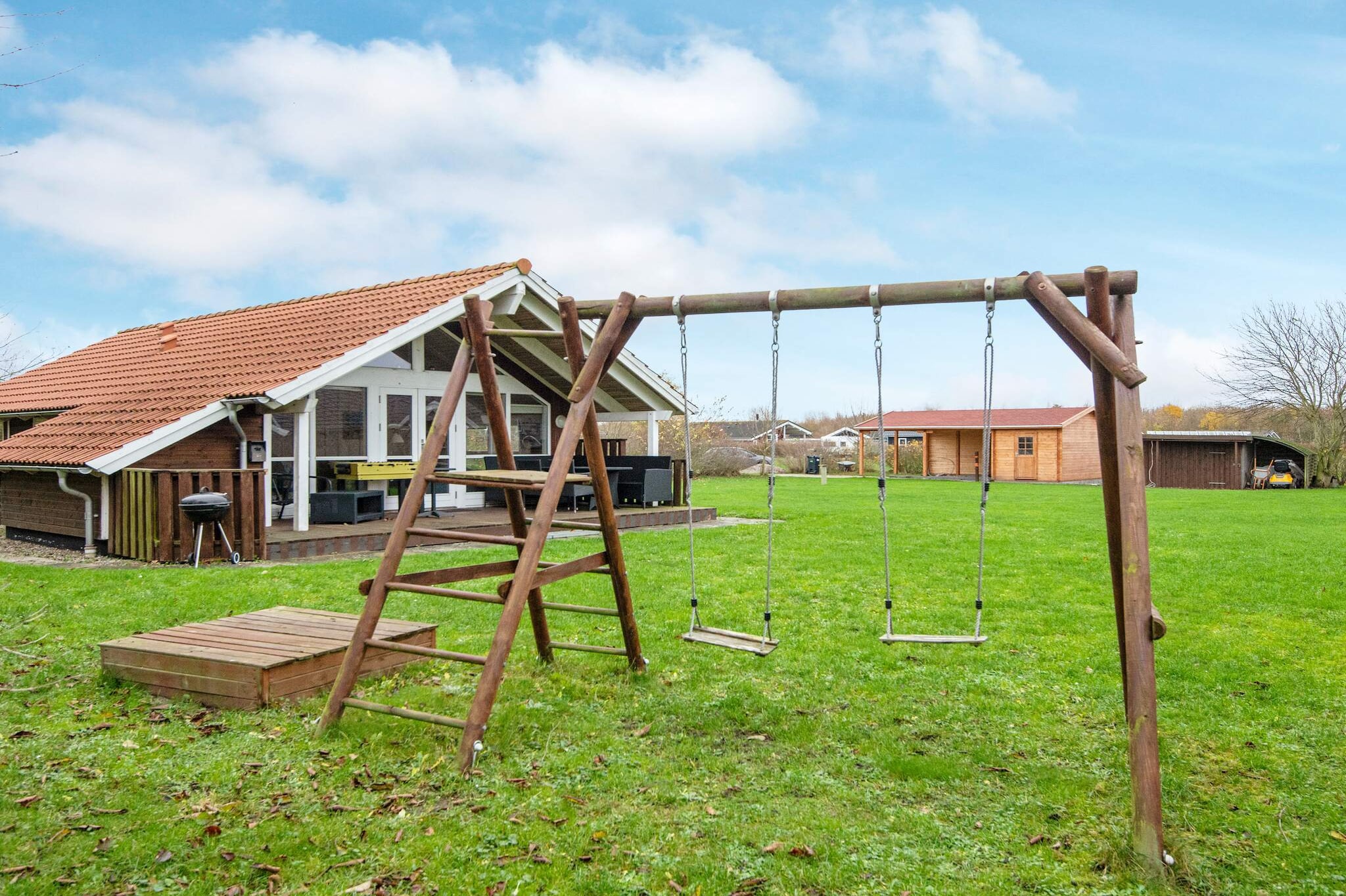open kitchen(cooker(electric), hood, coffee machine, microwave, dishwasher, fridge(+ freezer), tumble dryer, washing machine), Living/bed room(TV(cable, german television channels, danish TV channels (DR1 and TV2)), DVD player, CD player, stereo unit, high chair), bedroom(double bed), bedroom(double bed), bedroom(2x bunk bed), bedroom(2x bunk bed), bathroom(bathtub or shower, washbasin, toilet), Bubble bath(indoor, heated, 2 persons), sauna(indoor, heated, 4 persons), heating(electric), terrace, garden, BBQ, play equipment, air to air heatpump