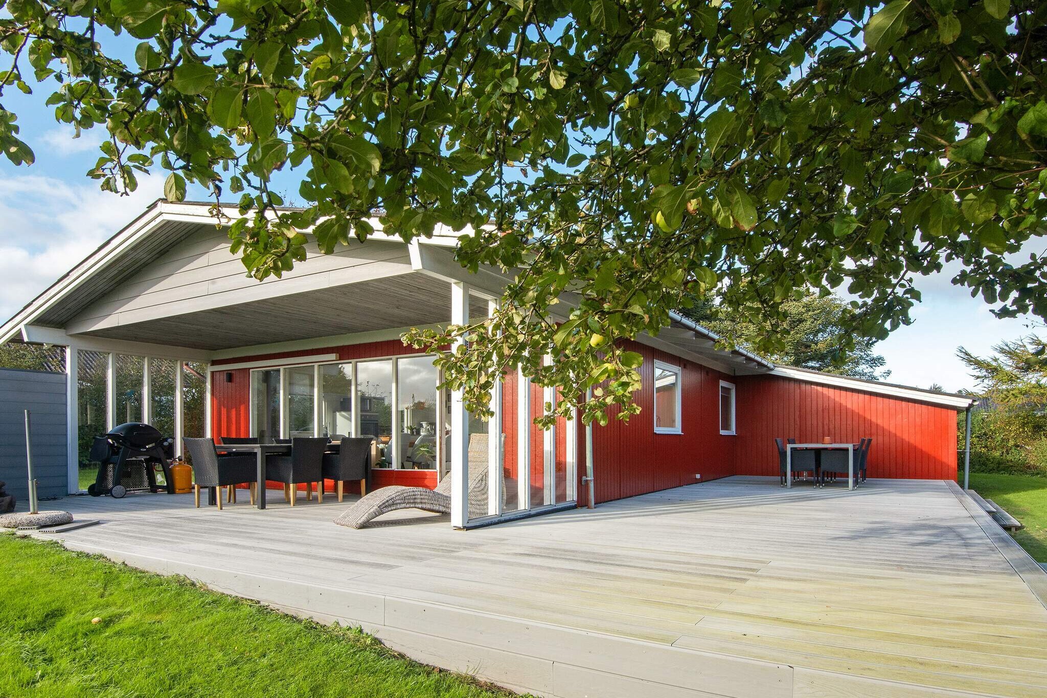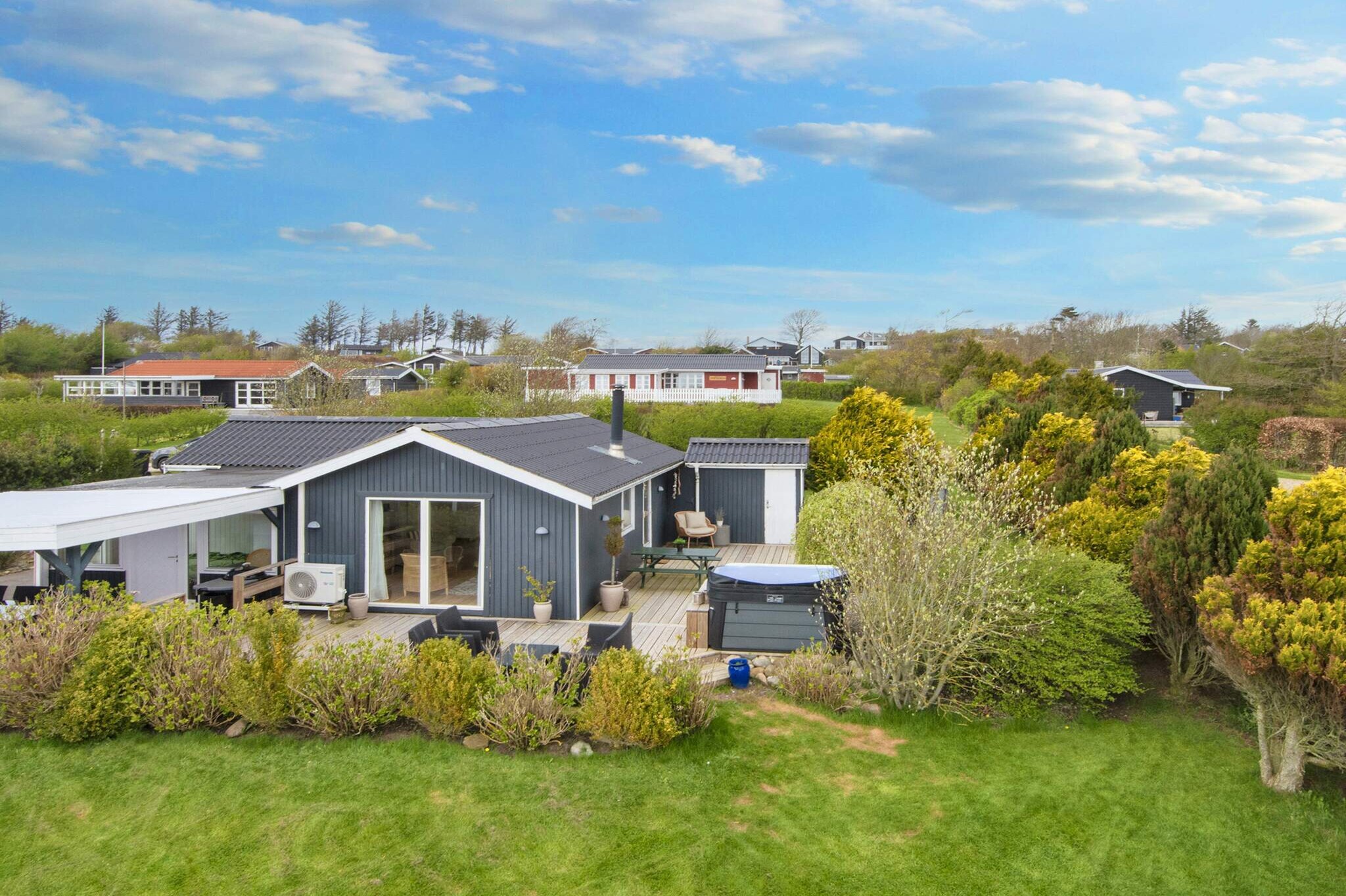 Kitchen(cooker(2 ring stoves), coffee machine, oven, microwave, fridge, freezer(60-99L)), Living/bed room(TV(danish TV channels (DR1 and TV2)), chromecast), bedroom(double bed, high chair), bedroom(double bed), bedroom(2x bunk bed), bathroom(washbasin, shower, toilet, washing machine), heating(electric), terrace, garden furniture, sun loungers, play equipment, air to air heatpump