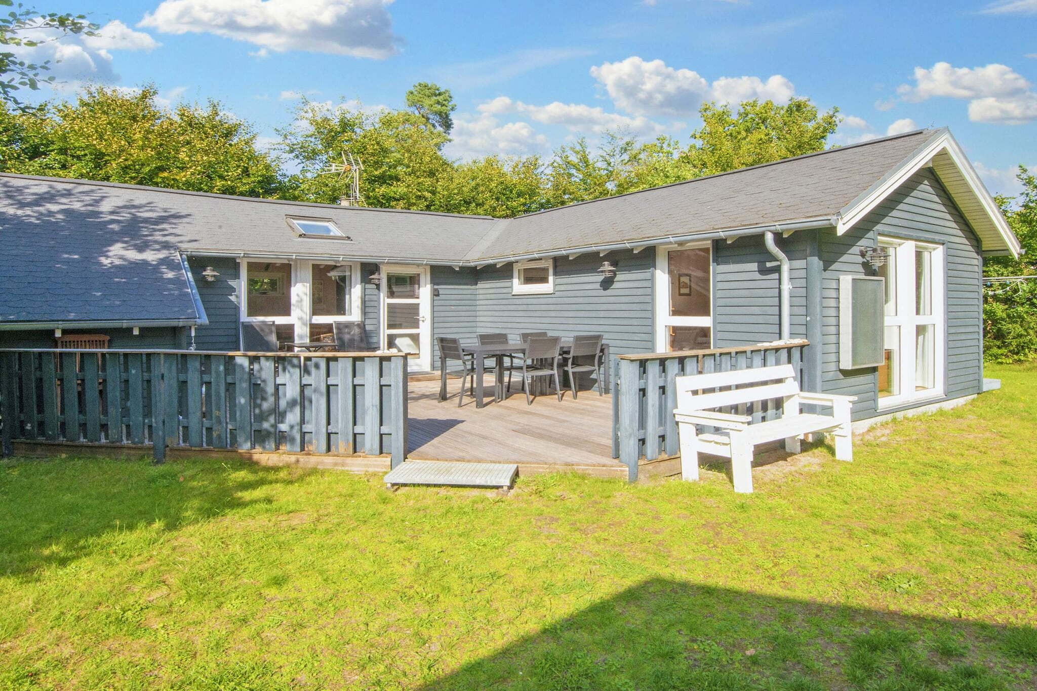The bathroom includes a toilet, shower, and the highlight—a whirlpool and sauna—perfect for relaxing. Outside, a spacious lawn provides plenty of room for ball games and outdoor fun. Children can enjoy the swing and sandpit, while the garden fire pit is ideal for roasting sausages or making traditional Danish “stick bread.†The terrace has a sun awning, comfortable garden furniture, and a charcoal grill, creating a perfect space to enjoy sunny days in privacy.