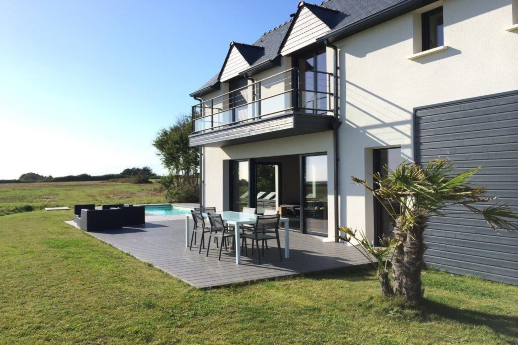 This is a beautiful modern villa with heated swimming pool and marvelous view. When you arrive, you will have an immediate holiday feeling, and can completely relax. You can have a barbecue in the spacious garden, while you enjoy the panoramic view. You immediately walk onto the beach direct from the house. The region is characterized by a mild climate and white sandy beaches. You will find them around Phouhinec (about 5 km). For excursions, you can visit the countless menhirs, dolmens and tumulus at Carnac (25 km), Vannes (50 km), with its beautiful half-timbered houses, and the peninsula of Quiberon (34 km), from where you can take a ferry trip (45 min) to the scenic island of Belle-Ile-en-Mer are also worth a look. In the center of Riantec (1.5 km) you will find several restaurants, a bakery and a supermarket. The home is fully equipped with a modern kitchen and comfortable bathrooms. You can barbecue in the spacious garden while enjoying the panoramic view.