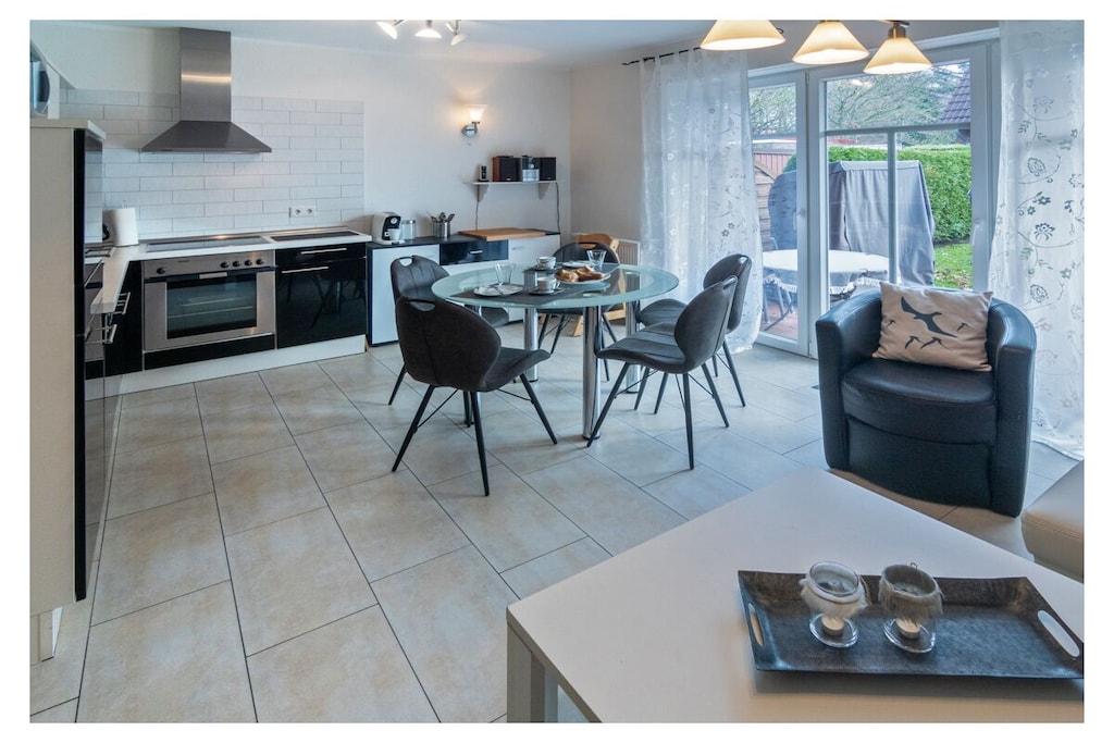 The very bright and friendly holiday apartment has space for two people. A lot of emphasis was placed on creating a cozy ambience when furnishing it. At the same time, the black and white color scheme and the sparing, but carefully selected decoration appear very modern. The entire apartment has been laid out with modern and practical tiles. The heart of your holiday home is the living and dining area with integrated fitted kitchen. This is where you can come together, whether to relax in the comfortable sofa corner in front of the TV, to have a quiet chat, to cook together in the modern kitchen or to eat together at the dining table. The TV area is equipped with a DVD and Blu-ray player, so nothing stands in the way of your cozy evenings in front of the TV. There is also access to the garden here. With its southeast orientation, it offers you the opportunity to enjoy the sunrise on nice days and thus start the day properly. The integrated seating area ensures comfort. The beach chair provides a real North Sea flair. A charcoal grill is also available.
