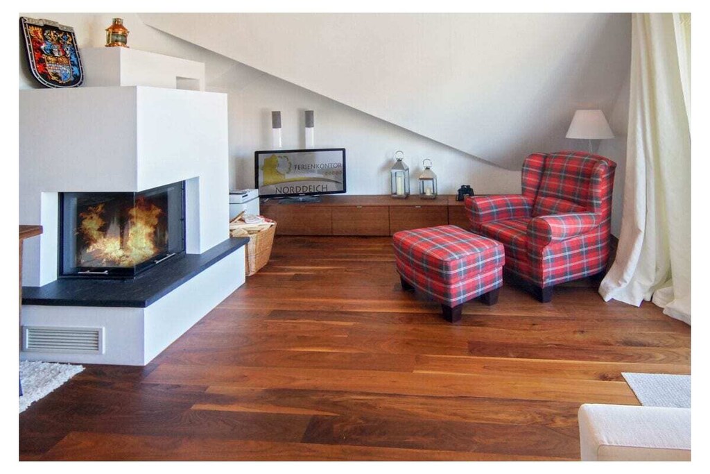 This elegant yet cozy penthouse apartment in the heart of Norddeich offers exclusive living flair - even during the holiday season. The apartment offers a loft-like, spacious living area that combines functionality and luxury in an appealing way. The living and dining areas are deliberately designed to be comfortable. The exclusive fitted kitchen from the "Bulthaupt" brand completes the representative open design of the loft. The parquet floor made of walnut wood, which also has a very luxurious character, is particularly exclusive. The wide window front ensures the perfect incidence of light. Thanks to the modern underfloor heating, comfort is guaranteed in every season. The apartment also has a fireplace in which a warming fire can be quickly lit in bad weather.