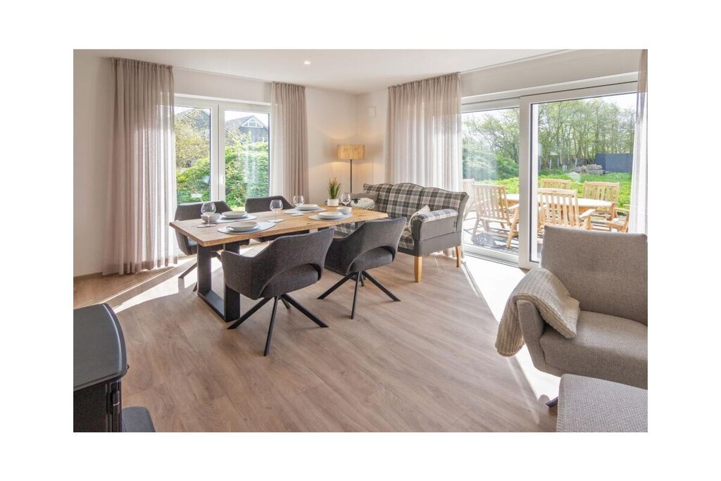 The adjoining dining area is also located in this living area. The large table with its four chairs and a cozy Friesian sofa offers enough space for four people. Be it for breakfast together, a sociable game night or for a home-cooked dinner in the evening.