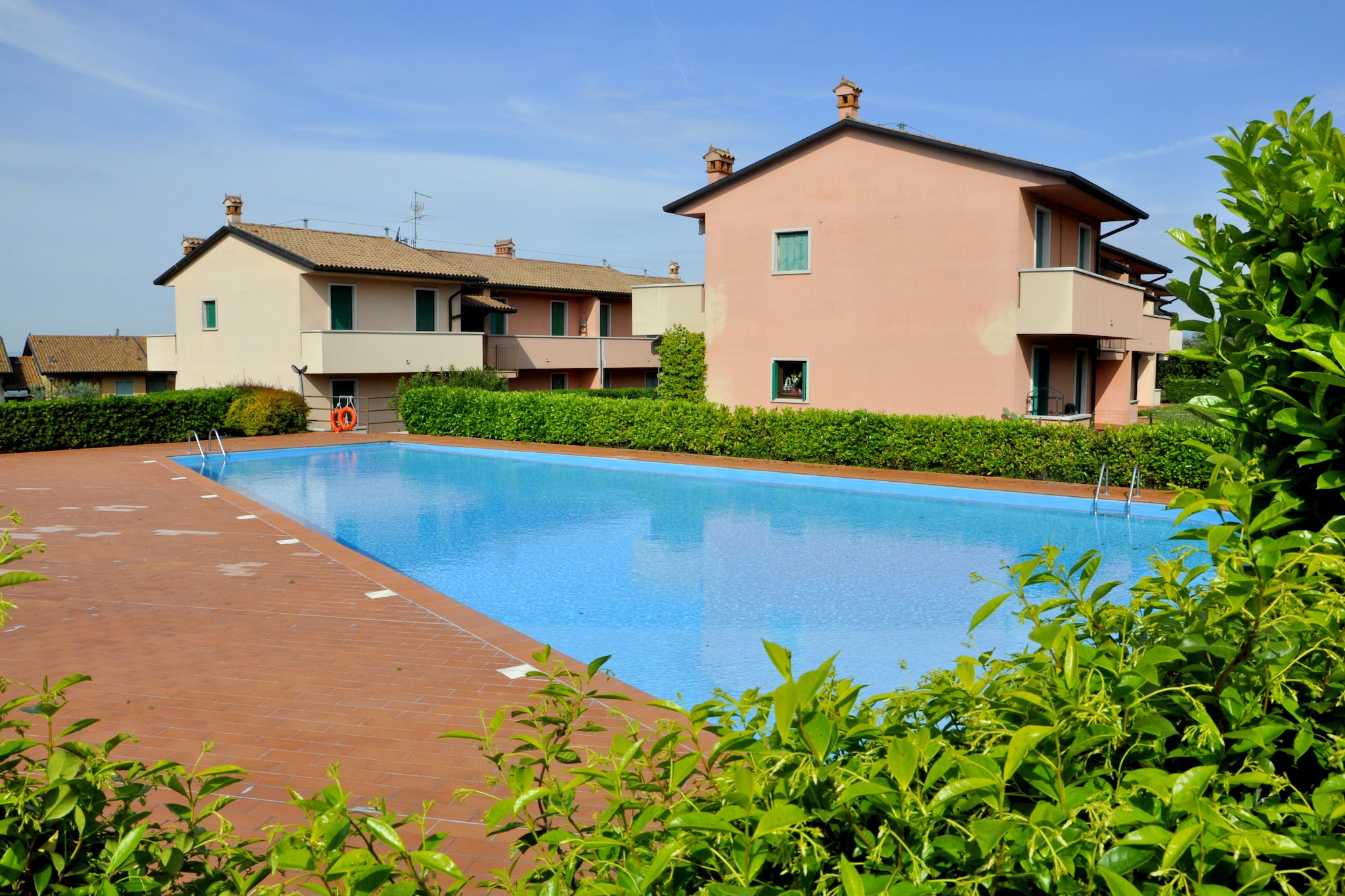 Guests can enjoy the fresh air on dual private balconies or relax on the shared outdoor terrace. The sparkling communal pool (14 × 6 m, open May to September) is perfect for sun-soaked afternoons, and covered parking via carport makes arrivals stress-free. Just 600 m from Lake Garda and 500 m from the historic town center, the location offers scenic walks and cultural discoveries, including Scaliger Castle and the Romanesque Church of San Nicolò.