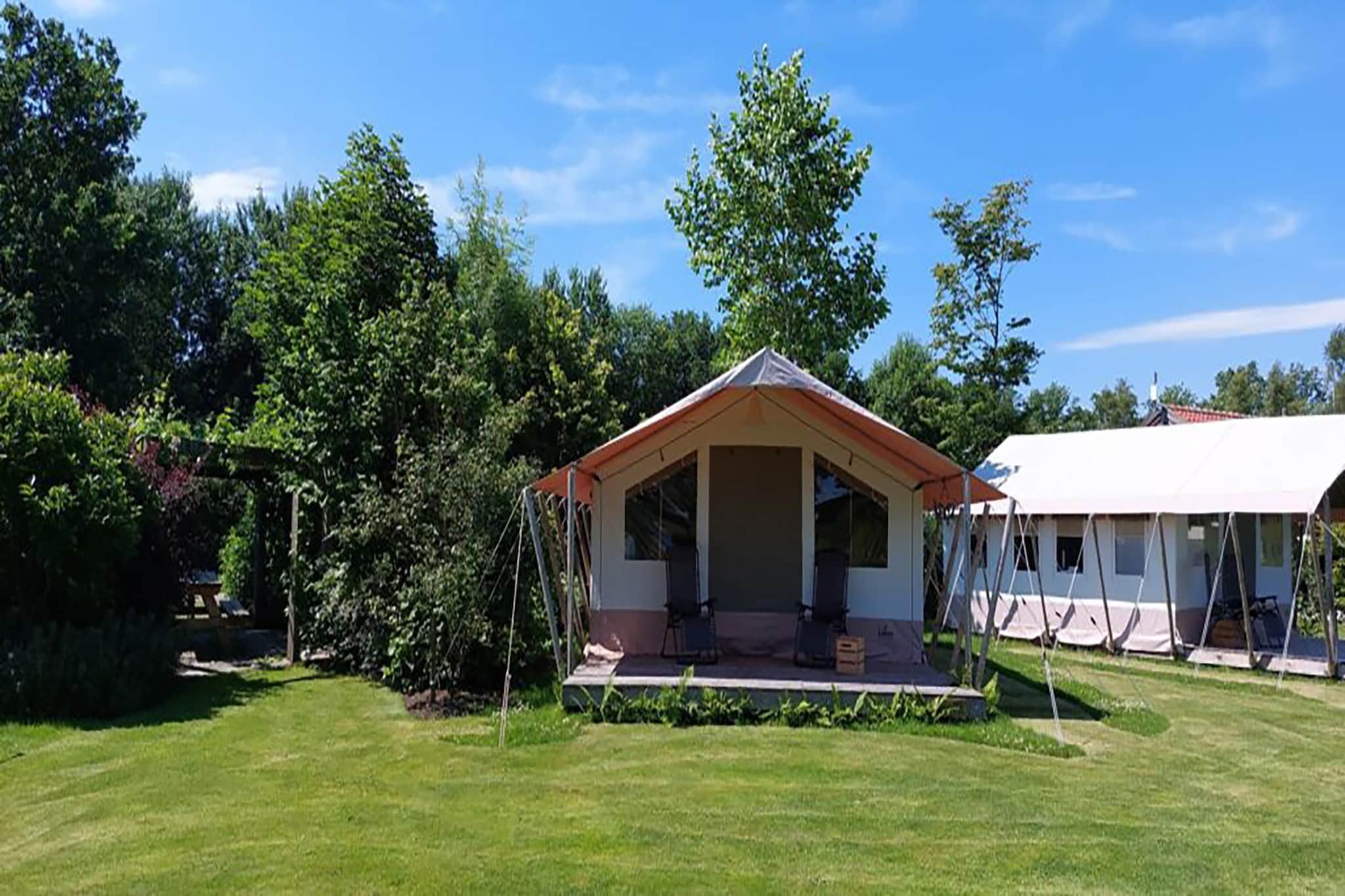 Experience the charm of camping with the comfort of a cottage in these fully equipped safari tents, nestled in the heart of Frisian nature. Set on wooden platforms and measuring 5 x 7.5 meters, each tent offers a cozy living area, two separate sleeping areas, and sturdy wooden furniture, comfortably accommodating up to 4 guests. The covered terrace and mobile kitchenette with fridge and 4-burner stove let you enjoy outdoor cooking on sunny days. Perfect for families or friends holidaying together, the tents are placed side-by-side on a peaceful, small-scale campsite in De Fryske Walden. Located directly on a bike junction route, it's a great starting point to explore the Frisian coulisse landscape and nearby nature reserves like Lauwersoog, 't Bûtefjild, and Twijzeler Mieden. The historic Eleven Cities town of Dokkum is just a short drive away, while Groningen and Leeuwarden are also easily accessible. For those seeking a unique blend of nature, simplicity, and convenience, these safari tents provide the ideal escape.