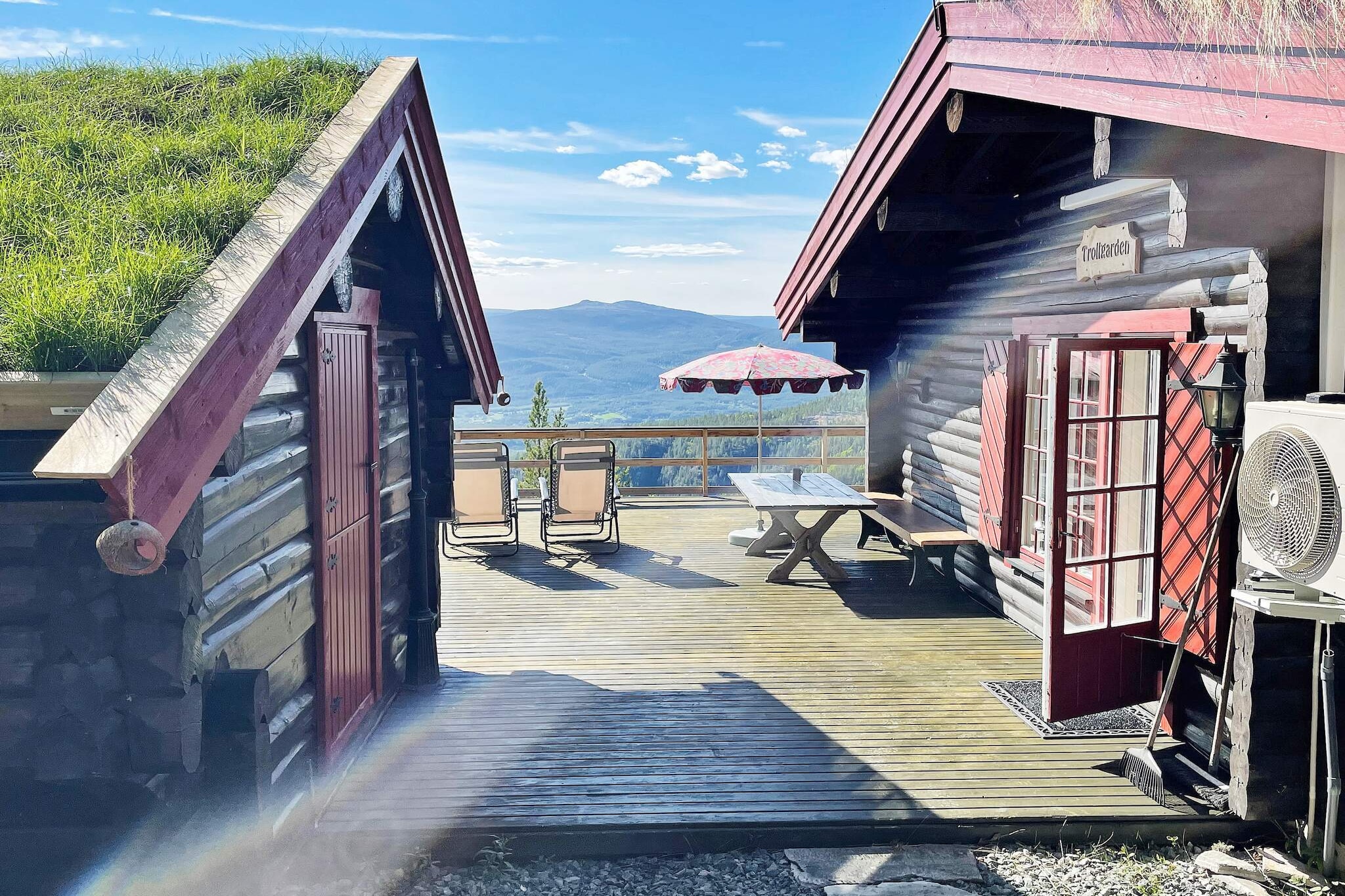 open kitchen(cooker(electric), hood, coffee machine(filter), microwave, dishwasher, fridge, freezer(60-99L), washing machine), Living/bed room(22 m2)(TV(norvegian TV channels ), chromecast), bedroom(double bed), bedroom(double bed), bedroom(single bed), bathroom(floor heating)(bathtub or shower, washbasin, toilet), heating(electric), terrace(43 m2), garden furniture, BBQ, parking, air to air heatpump