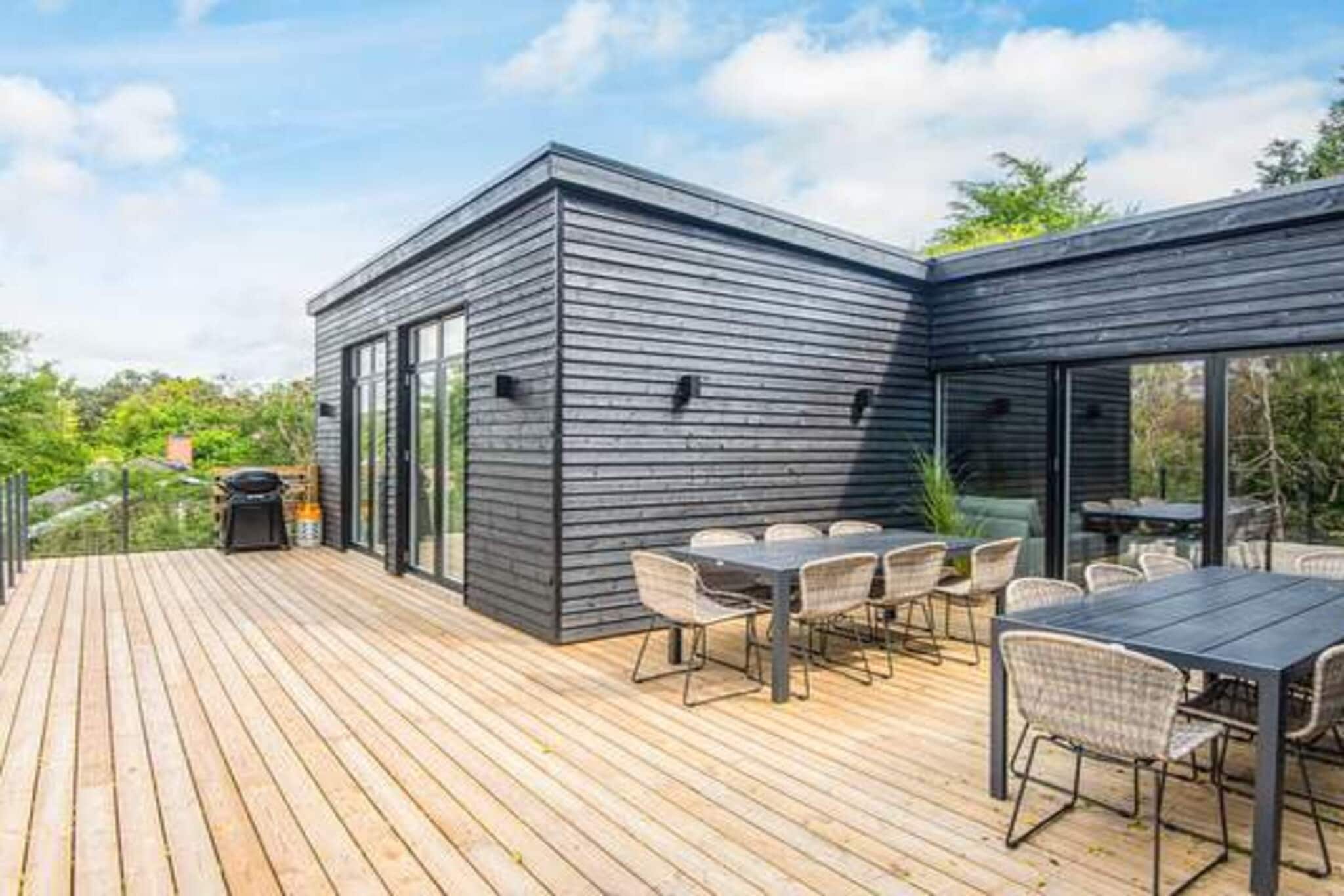 Kitchen(stove(induction), coffee machine, microwave, dishwasher, fridge-freezer, tumble dryer, washing machine), Living/bed room(TV, chromecast), bedroom(double bed), bedroom(double bed), bedroom(double bed), bedroom(double bed), bedroom(double bed), bedroom(double bed), bedroom(4x bunk bed), bathroom(washbasin, shower, toilet), bathroom(washbasin, shower, toilet), game computer, bath tub(outside, heated, 6 persons), Bubble bath(indoor, 6 persons), sauna(indoor, 8 persons), heating(electric), terrace, garden furniture, sun loungers, table tennis table, billiards