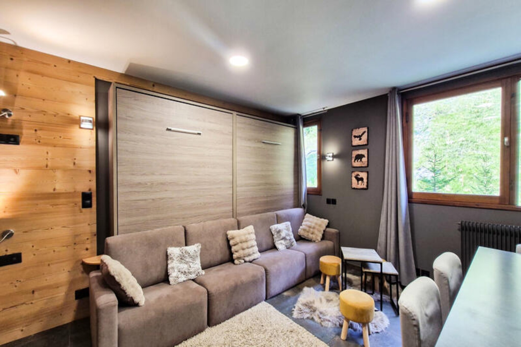 In the heart of the dynamic Flaine Forum district, this charming studio offers a cozy retreat just 150 meters from the slopes and ski school meeting points. Perfectly positioned for both winter sports enthusiasts and summer adventurers, the residence is surrounded by shops and amenities, ensuring convenience at every turn. Whether you're here to carve through pristine snow or explore the alpine trails, this location places you right in the center of it all. \n\nRecently renovated, the north-facing studio spans 25 m² and is thoughtfully equipped for up to four guests. The kitchenette boasts modern appliances, including induction hobs, an oven, microwave, mini dishwasher, and a Nespresso coffee maker for your morning brew. The living area features two double beds and a single bed, complemented by a flat-screen TV for relaxing evenings. A sleek shower room with a toilet and a pantry with a large refrigerator, freezer, and washer-dryer add to the comfort and practicality. Ski lockers are available for your gear, while duvets ensure a warm and restful night's sleep. Please note, the upper bunk is not suitable for children under six years old, and pets are not allowed.\n\nDuring the summer season, stays of six nights or more include the exclusive \