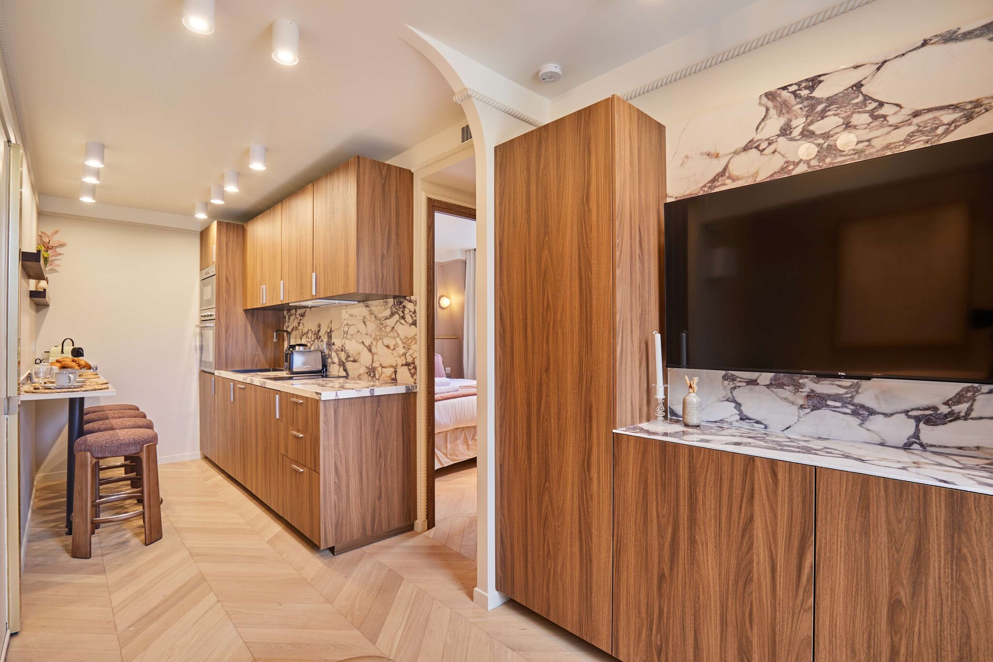 Discover our elegant apartment with a terrace, ideally located in the heart of the Marais. Designed like a true hotel suite with separate bedroom and living room, it has been completely renovated and air-conditioned to offer comfort and modern amenities. Its contemporary and refined ambiance invites relaxation after a day strolling through historic streets, visiting museums, boutiques, and iconic cafés. A privileged setting for a successful Parisian stay, whether with family or friends.