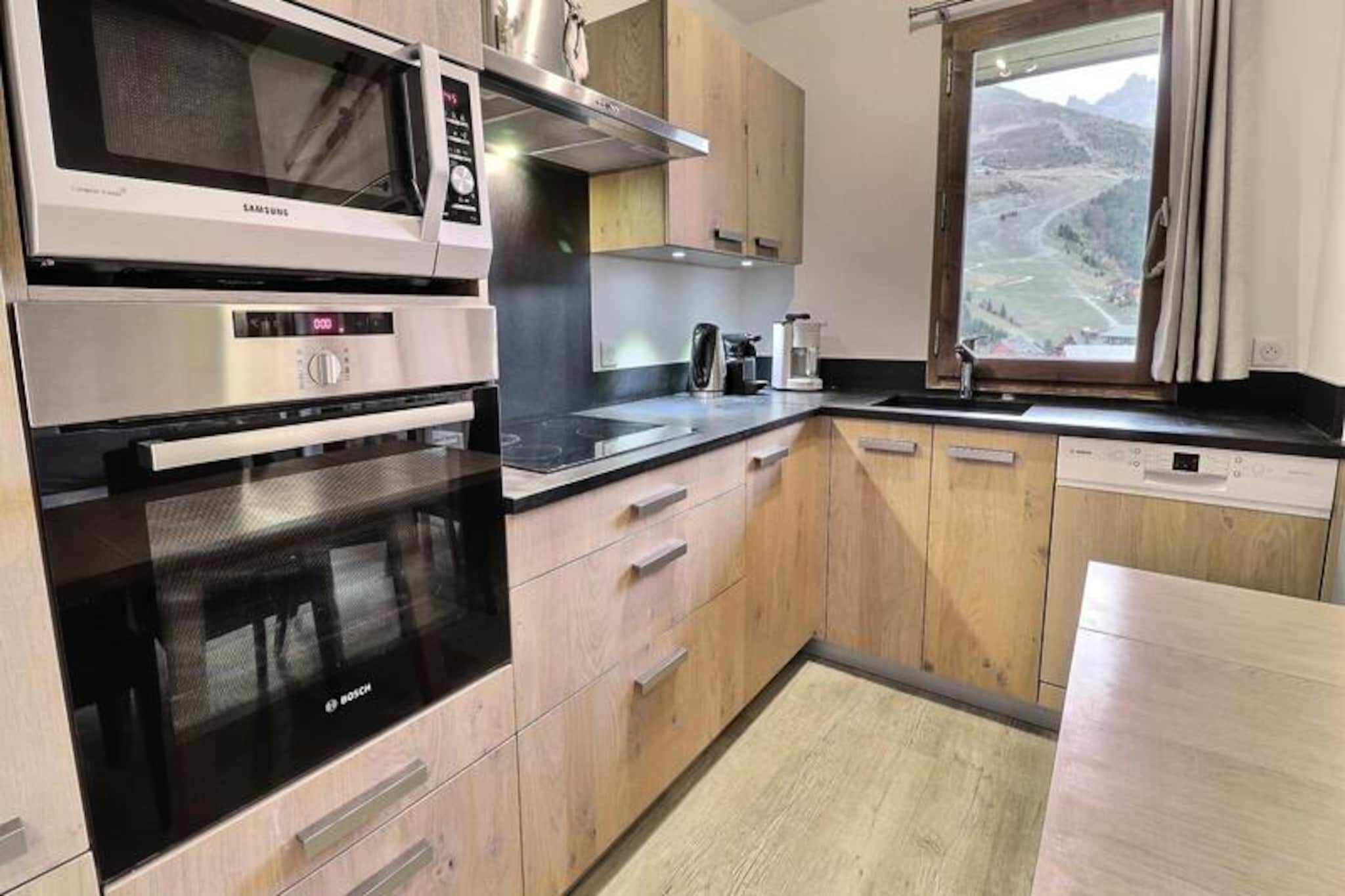 Designed for comfort and convenience, this 4-room duplex accommodates up to six guests. The living area features two cozy sofas, one of which converts into a bed, creating a warm and inviting space to unwind after a day on the slopes. The open-plan kitchen is fully equipped with modern appliances, including a Nespresso machine and dishwasher, making meal preparation a breeze. The bedrooms are thoughtfully arranged, with two single beds on the main floor and two additional bedrooms upstairs, one with a double bed and the other with twin beds under skylights, perfect for a restful night’s sleep.