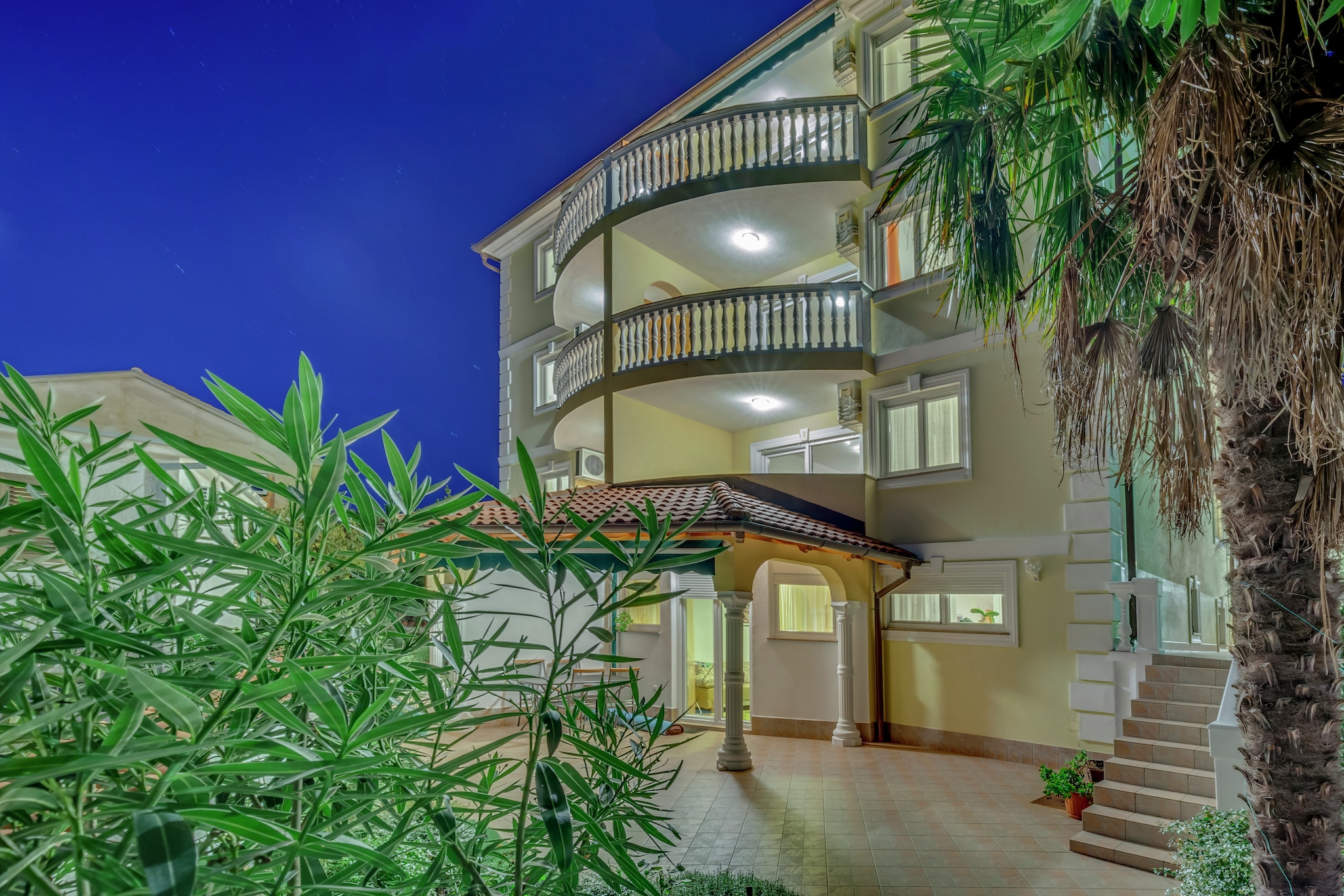 The tastefully furnished villa features 400 square meters of living space. The spacious living room, with hardwood oak parquet flooring, is bright and features large French doors leading to the terraces, a lush, well-kept garden, and a poolside area with up to eight sun loungers and stunning panoramic sea views of Crikvenica and the Kvarner Bay. The fully equipped kitchen, with a large dining table for up to eight people, is connected to the living room. All four bedrooms are equipped with very comfortable king-size beds, air-conditioned, hardwood floors, a Smart TV with Wi-Fi connection, and en-suite bathrooms, each with a bathtub/shower combination and double sinks, as befits a star rating. The two master bedrooms also feature a walk-in wardrobe, and the en-suite bathrooms each have a walk-in shower and a bathtub. Three bedrooms are on the ground floor with direct access to the garden via the balcony, while the fourth is on the first floor, all of which benefit from stunning panoramic sea views, including their en-suite bathrooms. A large double garage and two parking spaces complete this high-quality villa.
