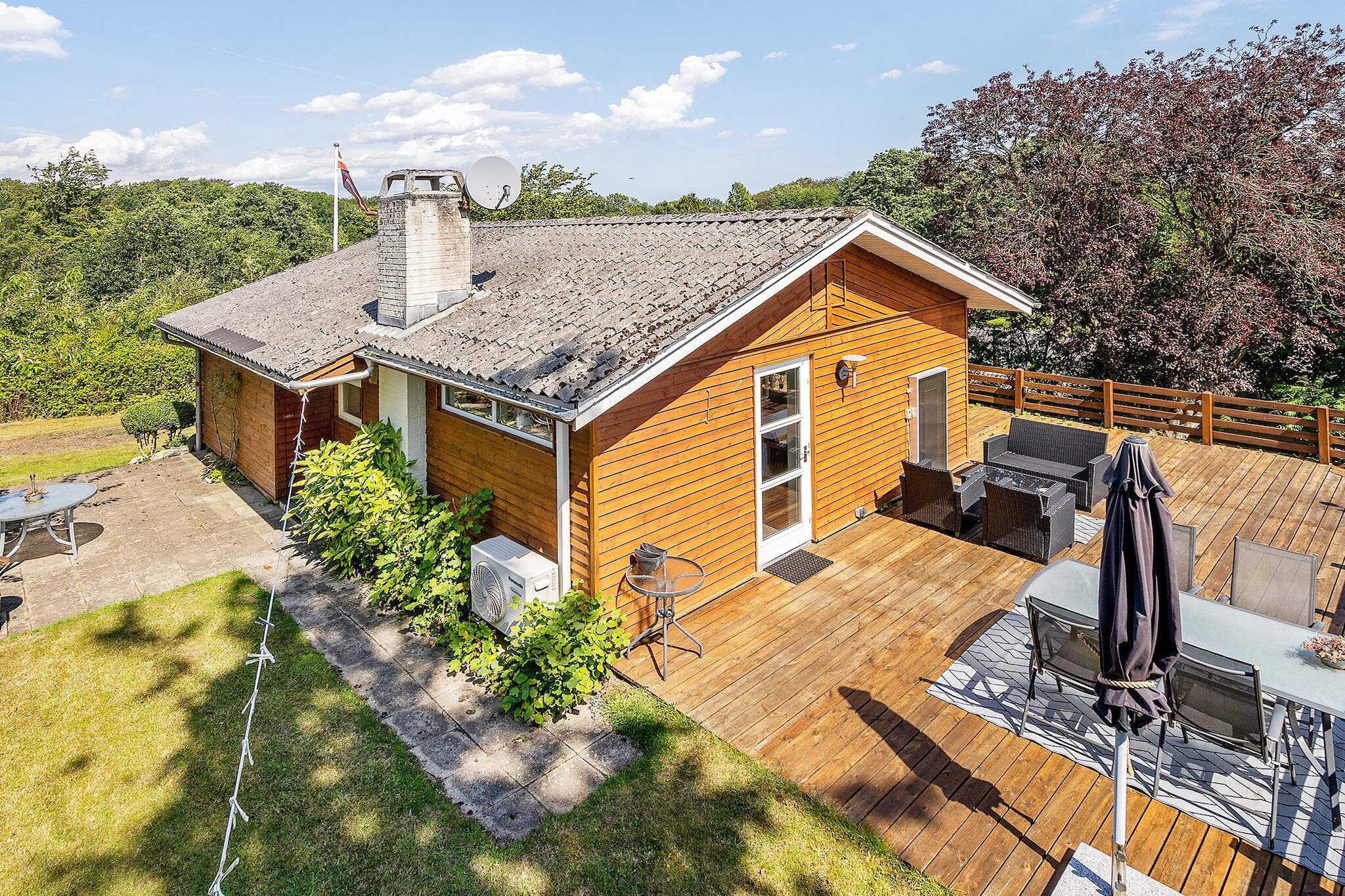 Annex: (double bed)\n\nLiving room(TV(german television channels, danish TV channels (DR1 and TV2)), high chair, chromecast), Kitchen(cooker(2 ring stoves), coffee machine, oven, microwave, fridge, freezer(100-139L)), bedroom(double bed, children\'s bed), bedroom(double bed), bedroom(2x bunk bed), bathroom(washbasin, shower, toilet), dishwasher, balcony or terrace, heating(electric), terrace, garden, garden furniture, sun loungers, children\'s bed, high chair, air to air heatpump