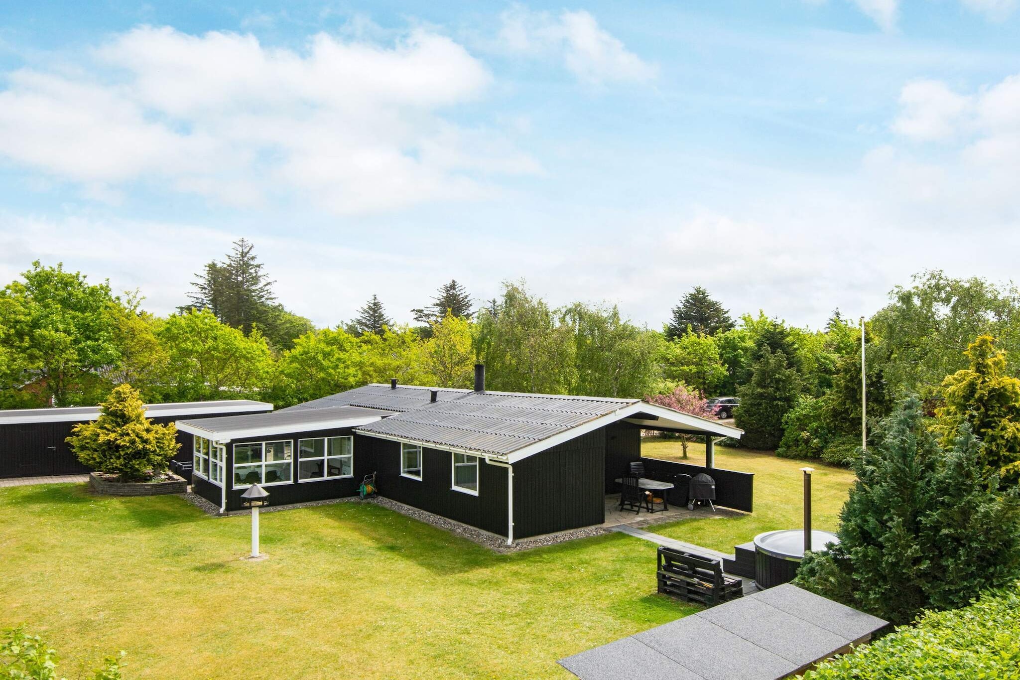 open kitchen(cooker(electric), hood, coffee machine, microwave, dishwasher, fridge(+ freezer), freezer(1-59L), tumble dryer, washing machine), Living/bed room(TV(cable, german television channels, danish TV channels (DR1 and TV2)), stereo unit, high chair), bedroom(double bed), bedroom(double bed), bedroom(2x single bed), bathroom(bathtub or shower, washbasin, toilet), mezzanine(2x single folding bed), carport, Bubble bath(indoor, heated, 2 persons), heating(electric), terrace, BBQ, air to air heatpump