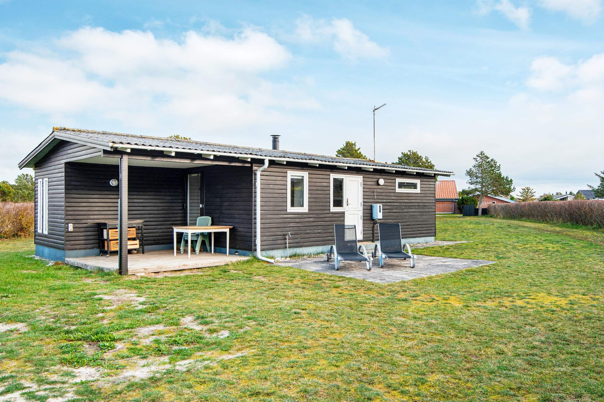 This well-maintained holiday home is located very close to the coast at Fjellerup Strand, making it an ideal destination for a relaxing beach holiday. The main house features two bedrooms, a small kitchen, and a spacious bathroom with a shower and washing machine. The interior is comfortably furnished, and on cooler evenings, you can enjoy the warmth and cozy atmosphere provided by the wood-burning stove. A separate annex on the property provides additional sleeping space, offering flexibility for families or small groups. Outside, the holiday home features a terrace that extends along two sides of the house, perfect for enjoying sunny days, outdoor dining, or relaxing evenings with a barbecue. From the terrace, guests can enjoy partial sea views, adding to the charm of this coastal property. The house is set on a large 1,200 m² natural plot, providing ample space for children to play safely in a private and secure environment. The surrounding landscape is quiet and scenic, offering a peaceful retreat while still being within easy reach of local beaches and coastal attractions. This holiday home is perfect for families or groups seeking comfort, privacy, and a coastal location where the natural beauty of the area can be fully appreciated. It combines indoor comfort with outdoor leisure, providing a versatile space for relaxation, play, and quality family time. Please note: rental is not available to youth groups.A refundable deposit might be charged closer to your check-in date. The security deposit ensures a smooth stay and covers any additional services or consumption charges.This deposit covers utilities consumed during your stay and any additional services that may be taken.The final amount will be adjusted based on actual meter readings, actual usage of extra services, and any remaining balance will be refunded within 21 days after checkout.This deposit simply acts as a prepayment for charges that  you would anyways pay for, ensuring a seamless stay and check-out experience.