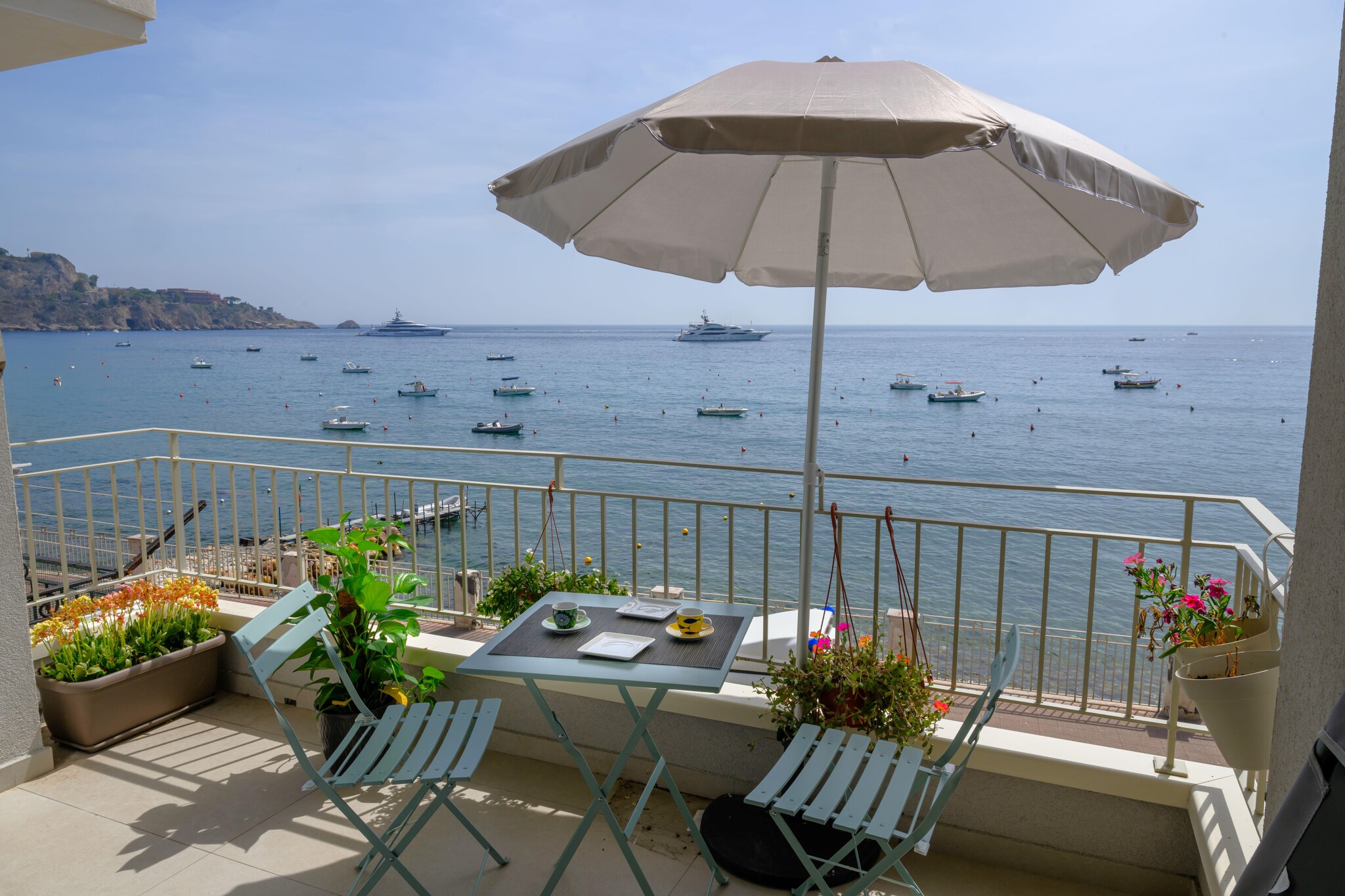 Your perfect holiday in Sicily! An elegant apartment equipped with all comforts just a few steps from the sea. A splendid view of the bay of Giardini Naxos and its wonderful sea, which you can admire and "experience" from a terrace that will leave you breathless! The apartment is perfectly located to enjoy the best of Giardini. The area where the house is located hosts shops, markets, characteristic restaurants and welcoming bars and is well connected by the nearby train and bus stations. Whether you are exploring the local attractions, relaxing on the beach or enjoying the lively city life, this apartment is the ideal base for an unforgettable holiday. Taormina is only 10 minutes away by car and Etna and its naturalistic and scenic beauties are also within easy reach. The apartment is newly built, has two views, is equipped with air conditioning in every room, and is composed of two bedrooms, a living room with a double sofa bed, a comfortable bathroom and a modern kitchen equipped for all your needs. An invitation to Sicily, to see, to live and to taste. Apartment on the 1st floor, in Corso Umberto I n.12, 110 square meters, composed of a balcony on the main street and a terrace overlooking the sea equipped with a tet a tet table, umbrella, outdoor sink, 1 bedroom with double bed double bed, 1 bedroom with two single beds that can be extended to accommodate an additional bed, large kitchen-living room with double sofa bed, 1 bathroom with shower, bidet, sink.