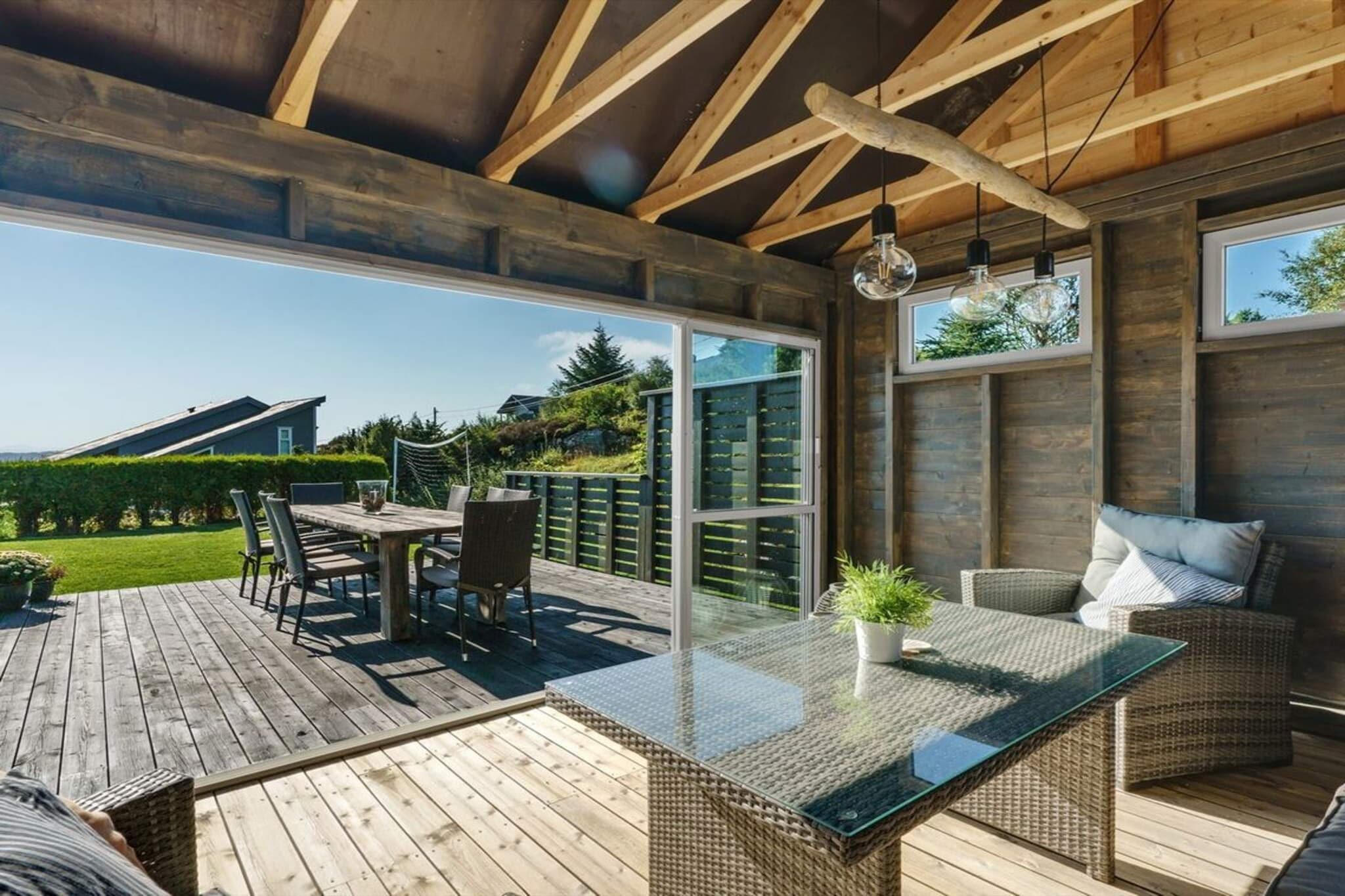 Beautiful, modern holiday home with a panoramic view of the sea, where you can enjoy the sunsets from a wilderness bath. Bright and pleasant holiday home in quiet surroundings. Through the large glass surfaces, you have a fantastic view of the sea and its changing panorama. A large terrace surrounds the house, here you will always be able to find a cozy, warm spot. Well-equipped kitchen. The house has 3 bedrooms and a loft with two mattresses. Steep stairs up to the loft where you need to be careful. Outside, you will find a wood-fired hot tub for relaxation. Great fishing opportunities from shore just a few hundred meters away. Good hiking opportunities nearby, also several lakes with fishing opportunities. Close by is Espevær, a car-free island with the famous UFO ring, the lobster park, and a lovely restaurant where you need to book in advance. Youth groups under 25 are not permitted.