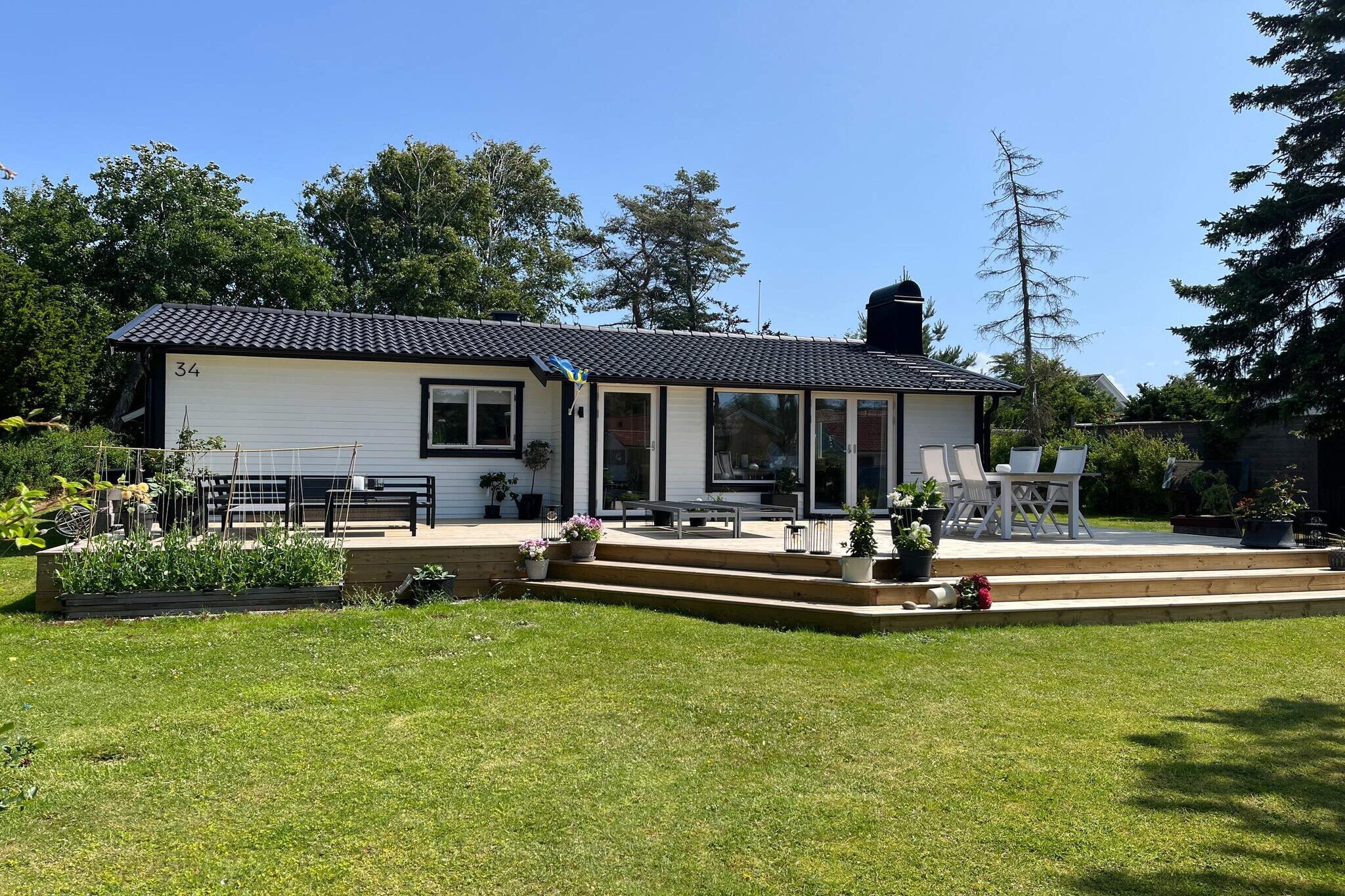 Welcome to a truly exceptional summer retreat – a spacious and beautifully designed holiday home just 500 meters from a miles-long, golden sandy beach! This is the perfect getaway for larger groups who value tranquility, quality of life, and high standards in a charming summer village. Here, you'll stay comfortably with plenty of room both indoors and outdoors – whether you're vacationing as a family, several couples, or a group of friends. As you pass through the gate, you're welcomed by a lush garden that basks in sunlight throughout the day. A generous wooden deck wraps around much of the house – ideal for leisurely breakfasts in the morning sun, tapas evenings under the open sky, or peaceful moments in the shade with a good book. Multiple seating areas invite you to relax and enjoy each other's company. At the heart of the home is a cozy, fully equipped kitchen that opens up to a spacious and airy living room. There’s plenty of room for everyone to cook, socialize, or simply enjoy relaxing summer days. From the living room, you can access both a charming little dining area and a fantastic conservatory of about 35 square meters, furnished with a dining area and a cozy lounge section. The conservatory quickly becomes everyone's favorite spot – perfect for long, warm summer evenings. The house features four bedrooms – three of them on the ground floor, all equipped with comfortable double beds. The fourth bedroom is located upstairs and includes two single beds, along with a lounge area that opens up to a lovely balcony. From here, you can catch a glimpse of the sea and enjoy the sun with a glass of wine or a cup of coffee. A bathroom with a shower and laundry facilities, as well as a separate guest toilet, are conveniently located on the ground floor near the entrance. With just a few minutes' walk to the beach – where the horizon meets the sea and the sand stretches as far as the eye can see – this is truly a paradise for anyone longing for sunshine, salty swims, and a genuine summer holiday. Whether you're seeking relaxation, quality time, or adventure, this home offers that little extra – a place you'll want to return to again and again. Nearby, Hökafältet offers beautiful running trails with outdoor gyms and a mountain bike track. The Mellby Shopping Center is within easy reach. In the area, you’ll also find a beach hotel, charming local shops, and several restaurants. There is also a popular leisure and fitness area nearby. To the south lies Skummeslövstrand, a lively summer destination. Great cycling paths lead you to both Laholm and Båstad. Explore the Bjäre Peninsula with all its picturesque summer villages – and not least Båstad, the iconic tennis town. Visit the lovely harbor area in Båstad and stop by the seaside bathhouse. Just north of Båstad you’ll find the beautiful Norrviken Gardens, a popular excursion destination. Laholm is only a short drive away, with a cozy town center full of small shops, cafés, and restaurants. The Lagan River meanders around the town, offering excellent salmon fishing and a smokehouse with a restaurant. The Hallandsåsen ridge offers scenic hiking trails, mountain biking paths, and a ski resort. To the north, you can easily reach Halmstad with its fantastic Tylösand beaches, vibrant entertainment scene, and numerous golf courses. The closest course is Laholm Golf Club, located just a short distance from the house.
