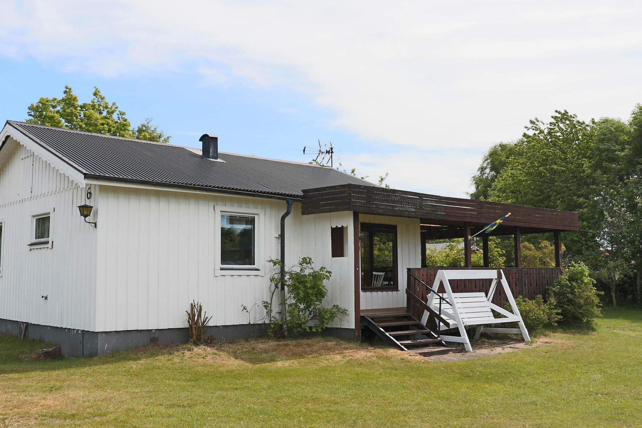 A pleasant and well-maintained holiday home in the northern part of Träslövsläge. The cottage's generous terrace offers several pleasant patios with outdoor furniture. Only a short walk takes you to "Läjet's" picturesque harbor and fine beach. Träslövslage has everything you need for a lovely holiday week. A short drive or bike ride takes you to Varberg's beautiful summer town. From the generous terrace you have a guest cottage on the right with two single beds and a sofa bed. No heating in here. In the main cabin there is a bedroom with a wider single bed and next to it a bathroom with shower. The living room and kitchen are open and have a dining area, a sofa bed for two people and a modern TV you can use if you have internet on your phone and a chromecast. The spacious terrace has a covered dining area and comfortable lounge furniture with a parasol. Between the entrance and the guest cabin is a small patio. The cottage is accessible with low thresholds, a ramp up to the terrace and entrance. The bathroom has a narrower door. In Träslövsläge with its idyllic harbor there is a restaurant, pizzeria, street kitchen, mini-golf and the very popular ice cream bar Tre Toppar where people like to queue up to buy the good ice cream. There is also nice beaches here. Varberg is a real summer town with a throng of people, taverns, cafes and dance halls, everything that belongs to a summer town. The massive Varberg Fortress guards the entrance to the harbor and can be seen from afar. Go on a tour down into the bastions and casemates, follow along from the 13th century to our own time. If you go south, you will immediately reach the nice summer town of Falkenberg with its fine selection of cafes, shops and restaurants. Here is also the fantastic long sandy beach at Skrea. Another nice excursion destination is the Åkulla beech forests and for those of you who are technically interested, it is not far to the world heritage site Grimeton. For those interested in golf, there are several fine golf courses nearby, the closest is Varbergs Gk, the western course.
